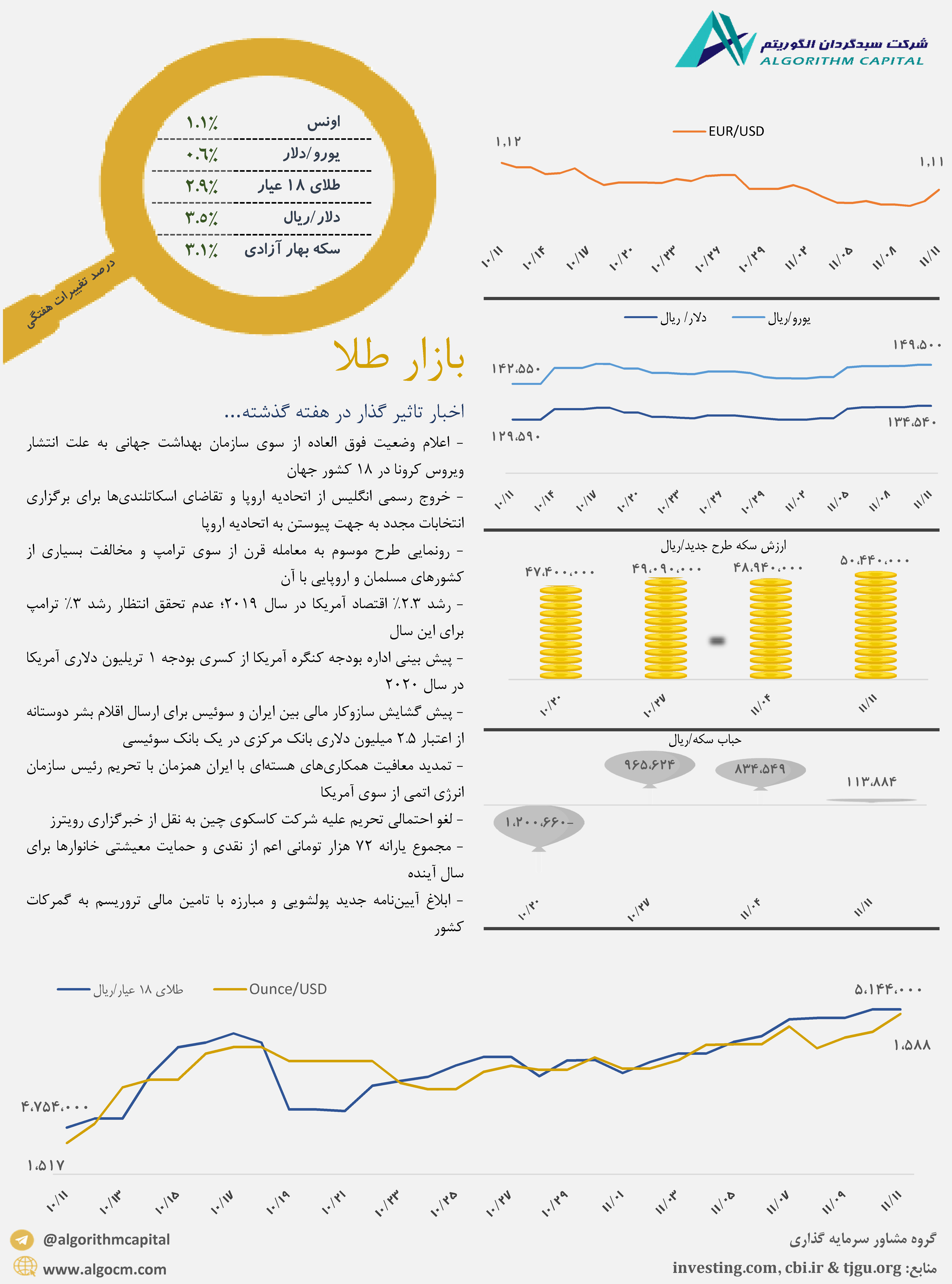 مهار رشد قیمت طلای جهانی به علت ویروس کرونا با انتشار گزارشهای مطلوب اقتصادی در اروپا و آمریکا