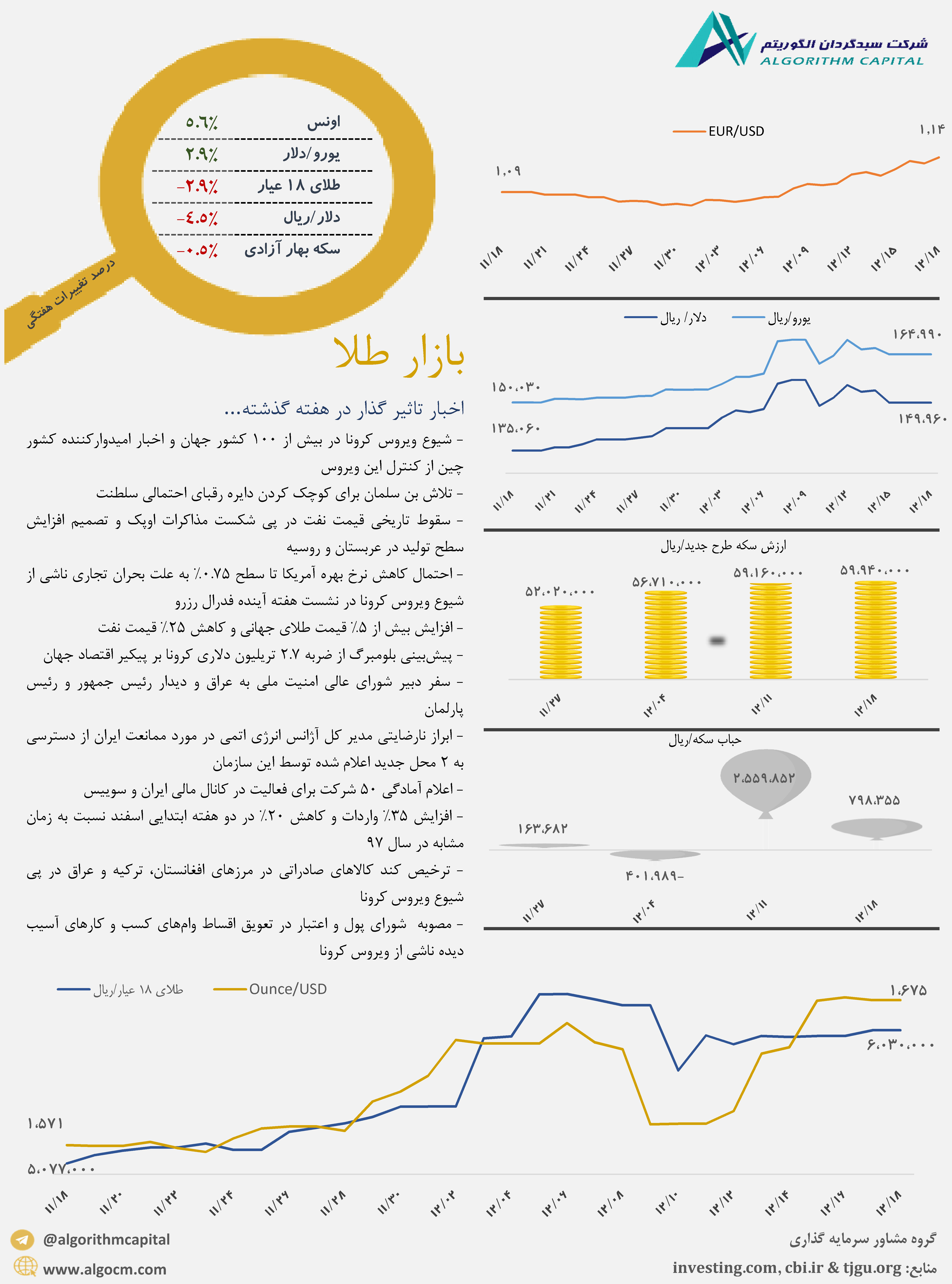 بیشترین صعود قیمت طلای جهانی در طی یک هفته در 11 سال گذشته با 5.6 درصد رشد