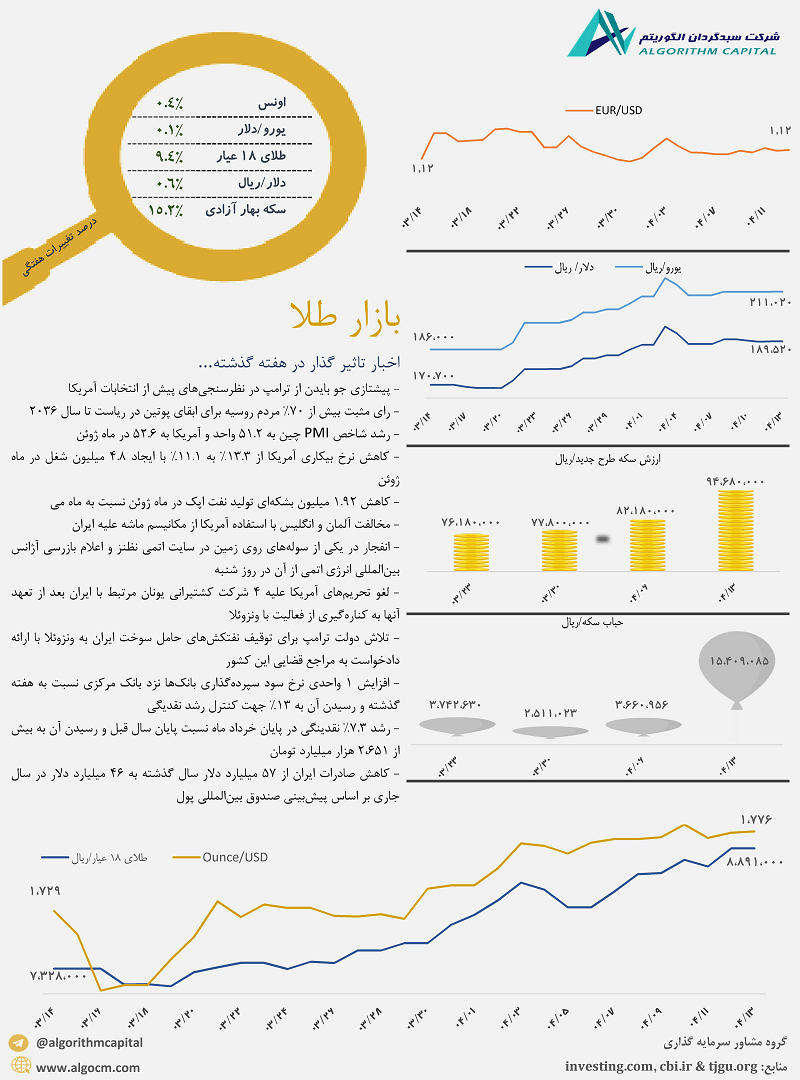 در گزارش پیشرو مبنای محاسبه حباب سکه طلا قیمتهای اعلامی دلار صرافی ملی توسط بانک مرکزی میباشد که در صورت جایگذاری نرخ دلار آزاد با آن حباب سکه از حدود 1.5 میلیون تومان به 680 هزار تومان کاهش خواهد داشت. در هفته گذشته به رغم نگرانی از موج جدید ابتلا به ویروس کرونا، ارائه گزارشهای مطلوب اقتصادی سبب فشار بر قیمت جهانی طلا گردید و از رشد آن جلوگیری نمود.