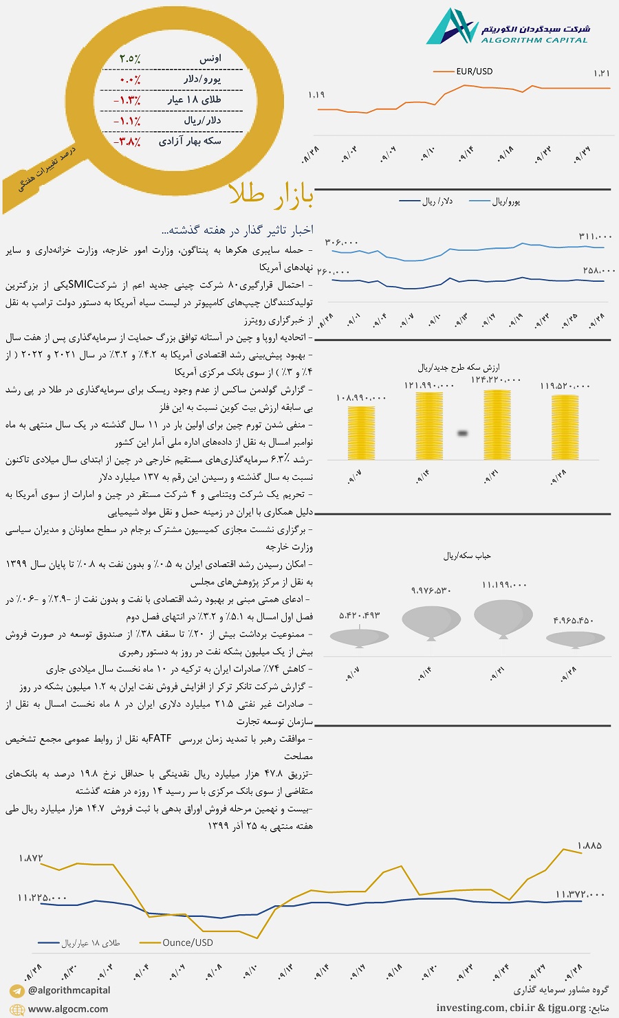 احتمال تصویب بسته ۹۰۰ میلیارد دلاری محرک اقتصادی آمریکا و تصمیم فدرال رزرو برای پایین نگه داشتن نرخ بهره برای مدت طولانی عامل سقوط شاخص دلار و افزایش قیمت جهانی طلا در هفته گذشته