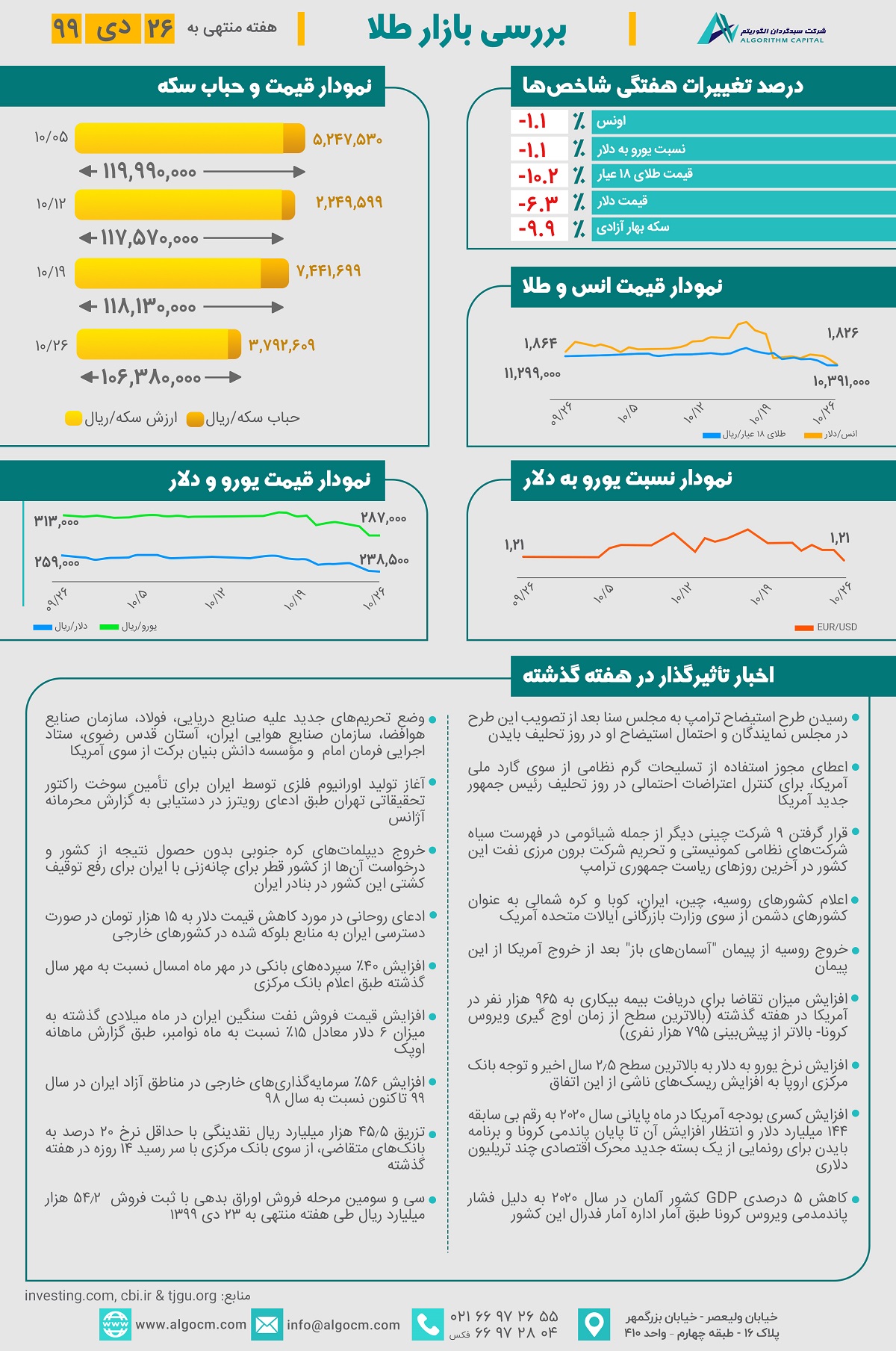 در هفته گذشته اونس جهانی با کاهش یک درصدی به 1826 دلار رسیده است. بهای هر قطعه سکه بهار آزادی با کاهش 10 درصدی به 106,380,000ریال و هر گرم طلای 18 عیار با کاهش 10 درصدی به 10,391,000 ریال رسیده است. با توجه به روند کاهشی طلای جهانی و کاهش 6 درصدی قیمت دلار حباب سکه نیز 49 درصد کاهش یافته و رقم 3,792,609 ریال را ثبت کرده است.
