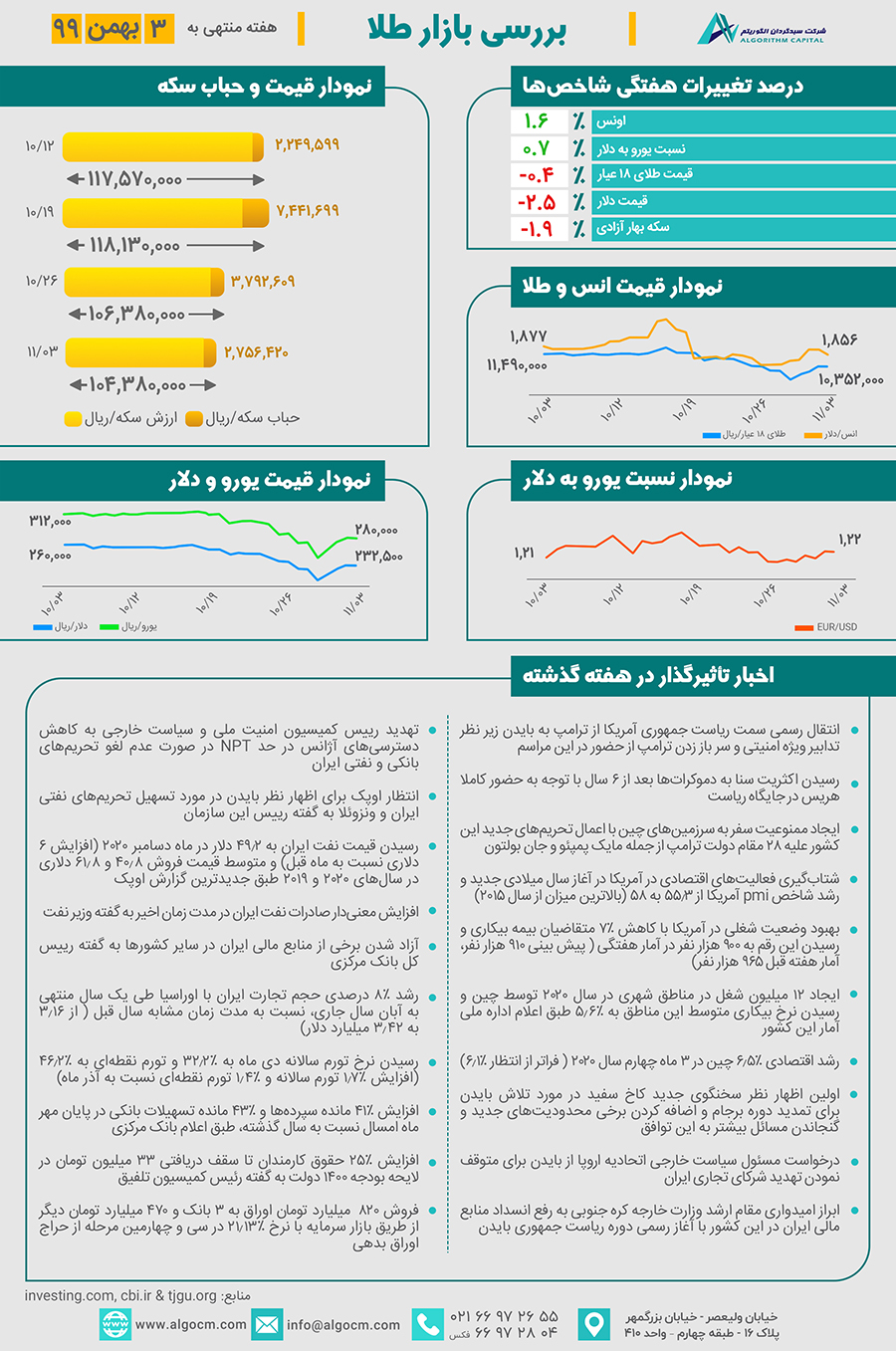 در هفته گذشته همزمان با کاهش 1% شاخص دلار، قیمت هر اونس طلای جهانی با رشد 1.6% به 1،856 دلار رسید. بهای هر قطعه سکه بهار آزادی تحت تأثیر کاهش 2.5% قیمت دلار، 1.9% کاهش داشت و به رقم 104،380،000 ریال رسید و قیمت هر گرم طلای 18 عیار با کاهش 0.4%، رقم 10،352،000 ریال را ثبت نمود. با توجه به روند کاهشی قیمت دلار در هفته گذشته حباب سکه در مسیر کاهش قرار گرفت و از رقم 3،792،609 ریال با ثبت کاهش 27% به رقم 2،756،420 ریال رسید.