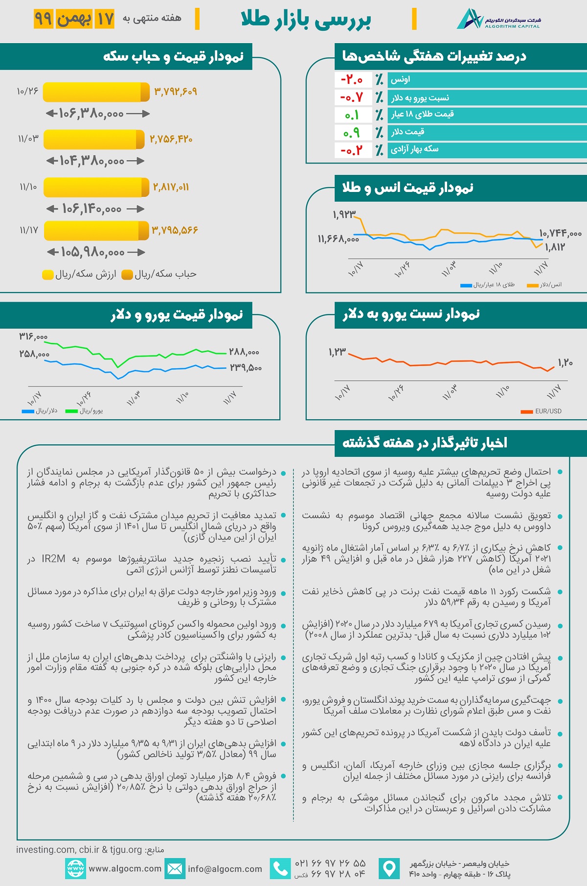 در هفته گذشته اونس جهانی تحت تاثیر توزیع واکسن کرونا و بهبود آمار مبتلایان، با کاهش 2 درصدی به 1812 دلار رسیده است. در بازار داخلی روند سکه و طلا تغییرات محسوسی نداشتهاند و هر گرم طلای 18عیار با رشد 0.1 درصدی به 10,744,000 ریال و بهای هر قطعه سکه تمام بهار آزادی با کاهش 0.2 درصدی به رقم 105,980,000ریال رسیده است.