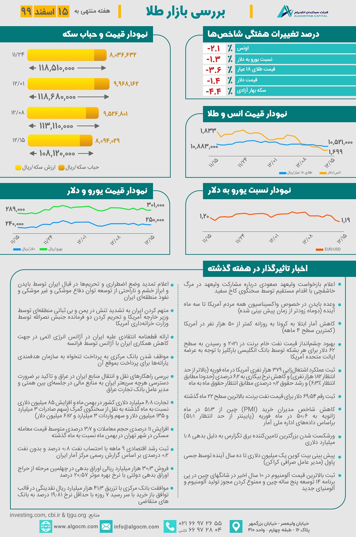 در هفته گذشته اونس جهانی تحت تأثیر افزایش نرخ اوراق قرضه دولتی با کاهش 2.1 درصدی به 1699 دلار و هر گرم طلای 18عیار با کاهش 3.6 درصدی به 10,521,000 ریال رسیده است. بهای هر قطعه سکه تمام بهار آزادی همراه با کاهش 1.4 درصدی قیمت دلار با کاهش 4.4 درصدی همراه بود و به رقم 108,120,000 ریال در هفته گذشته رسیده است. حباب سکه نیز با کاهش 15 درصدی به رقم 8,094,029 ریال رسید.
