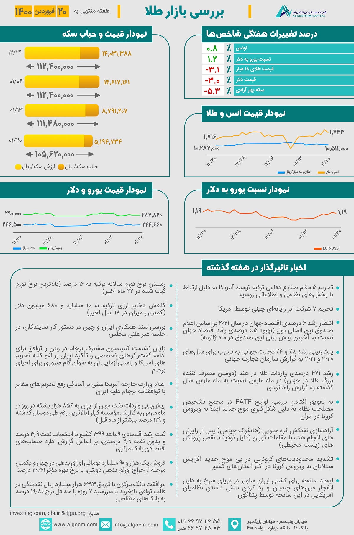 در هفته گذشته اونس جهانی با توجه به افت شاخص دلار و بازده اوراق خزانه آمریکا با افزایش 0.8 درصدی به 1743 دلار و هر گرم طلای 18 عیار با کاهش 3.1 درصدی به رقم 10,511,000 ریال رسیده است. بهای هر قطعه سکه بهار آزادی در پی اخبار مربوط به مذاکرات برجامی همراه با کاهش 3 درصدی قیمت دلار با کاهش 5.3 درصدی مواجه بوده و به رقم 105,620,000 ریال رسیده است. حباب سکه نیز با کاهش 3,596,473 ریالی نسبت به هفته گذشته به رقم 5,194,734 ریال رسیده است.