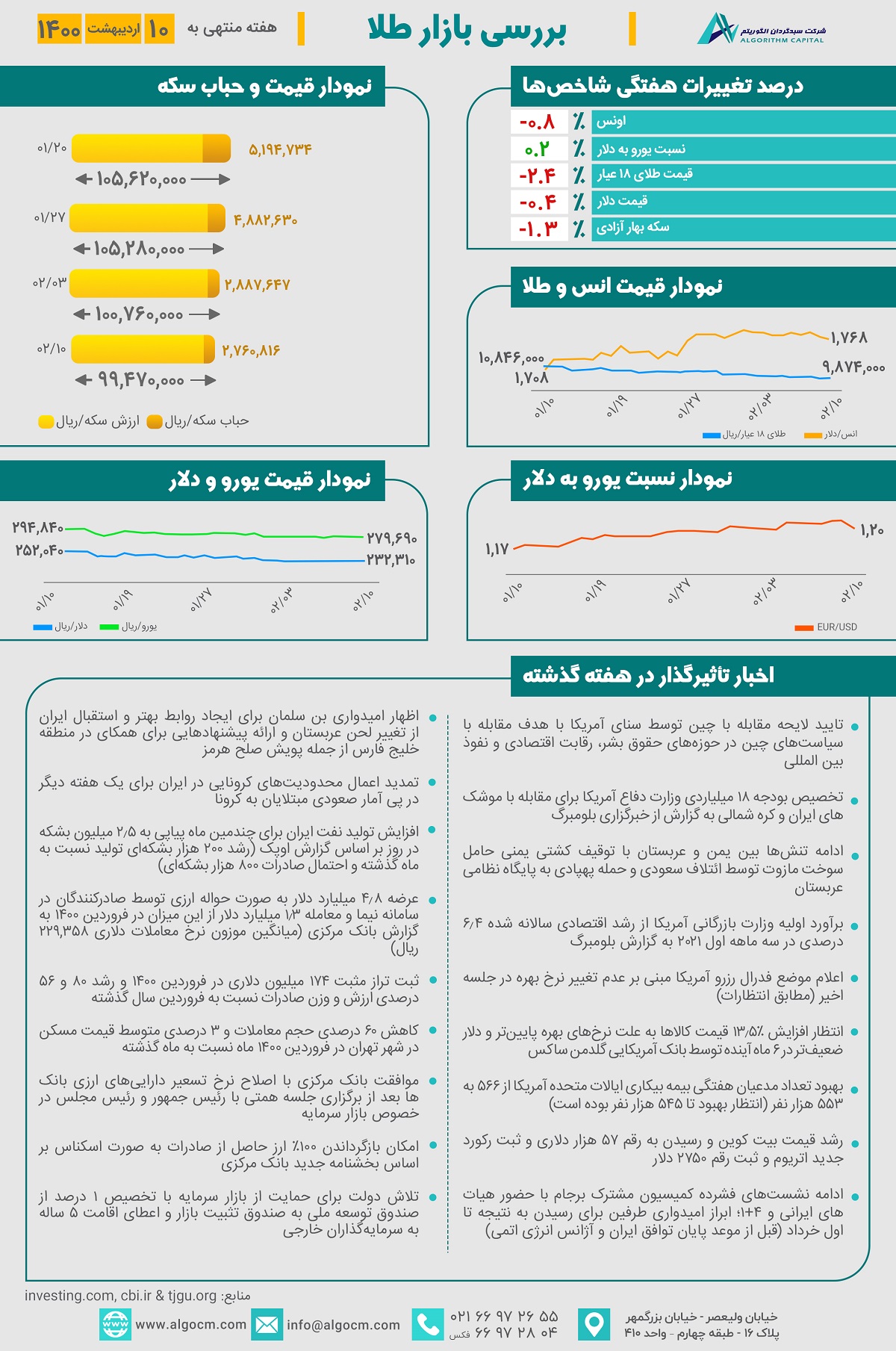 در هفته گذشته اونس جهانی با کاهش 0.8 درصدی به رقم 1,767 دلار و هر گرم طلای 18 عیار با کاهش 2.4 % به رقم 9,874,000 ریال رسیده است. بهای هر قطعه سکه بهار آزادی در پی اخبار مربوط به مذاکرات برجام همراه با کاهش 0.4 درصدی قیمت دلار با کاهش 1.3 درصدی مواجه بوده و به رقم 99,470,000 ریال رسیده است. حباب سکه نیز با کاهش 6 درصدی نسبت به هفته گذشته به رقم 2,716,501 ریال رسیده است.