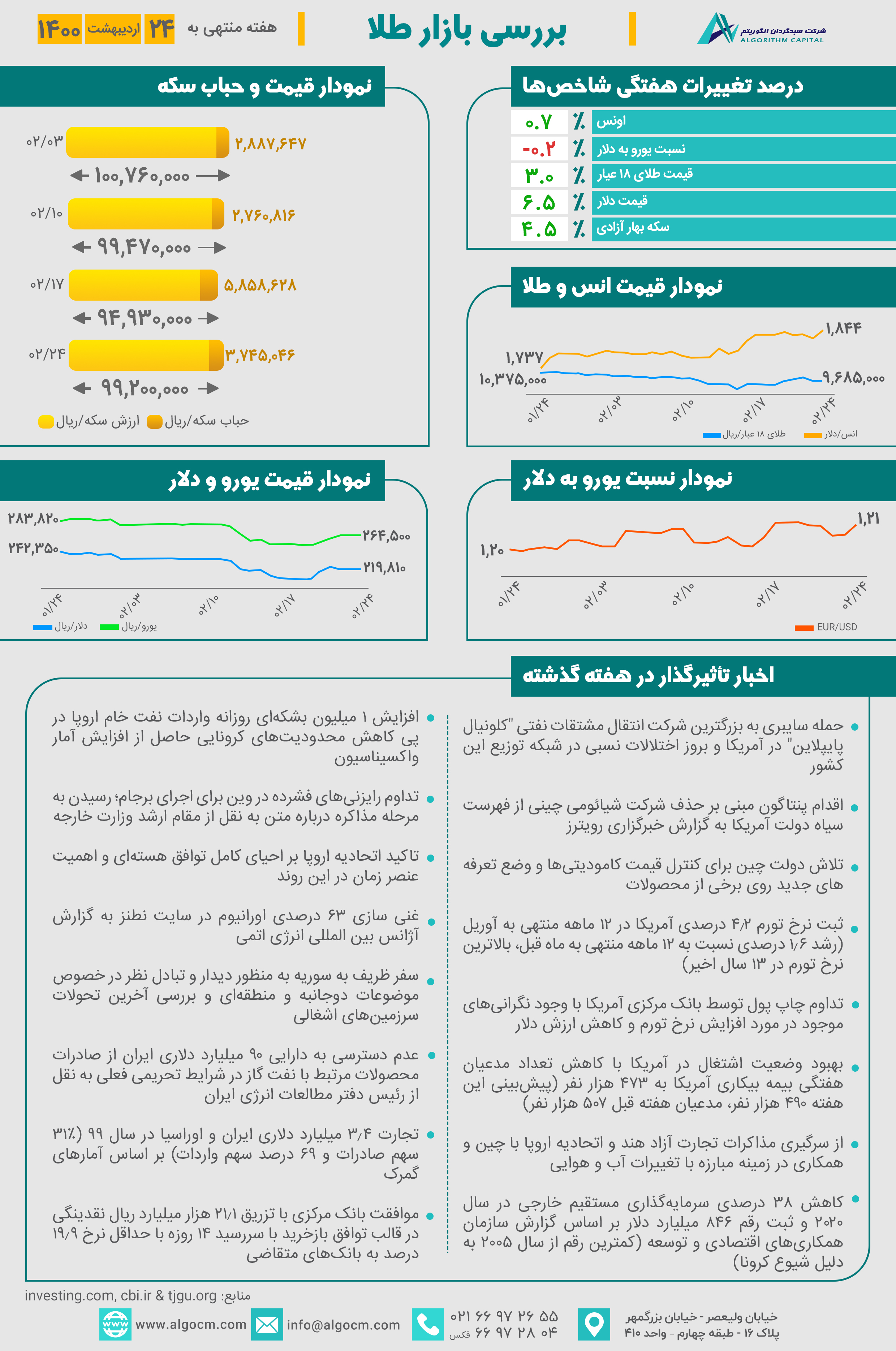 در هفته گذشته اونس جهانی با افزایش 0.7 درصدی به رقم 1,844 دلار و هر گرم طلای 18 عیار با افزایش 3 % به رقم 9,685,000 ریال رسیده است. بهای هر قطعه سکه بهار آزادی همراه با افزایش 6.5% قیمت دلار با رشد 4.5 درصدی مواجه بوده و به رقم 99,200,000 ریال رسیده است. حباب سکه نیز با کاهش 2,113,581 ریال نسبت به هفته گذشته به رقم 3,745,046 ریال رسیده است.