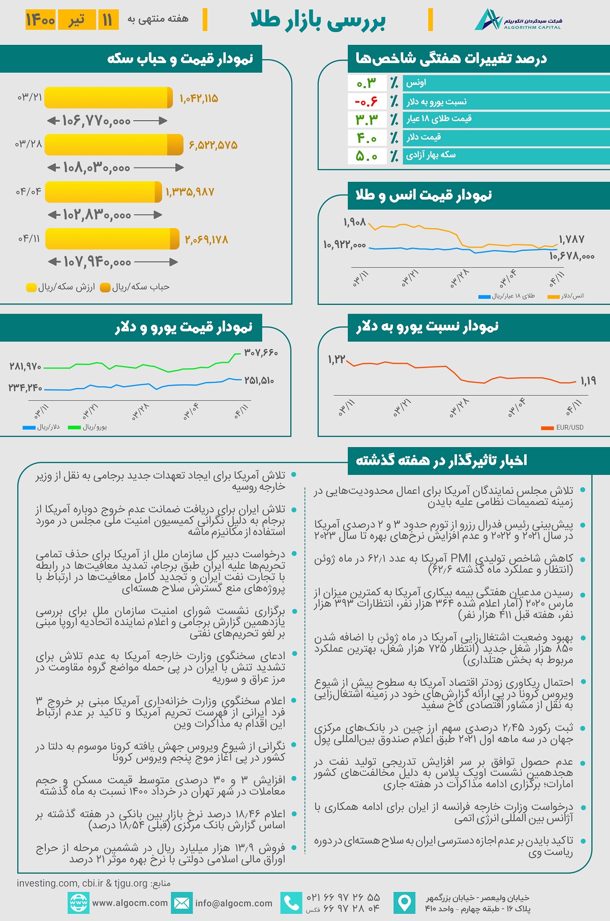 در هفته گذشته اونس جهانی با افزایش 0.3 درصدی به رقم 1,787 دلار و هر گرم طلای 18 عیار با افزایش 3.3 درصد به رقم 10,678,000 ریال رسیده است. بهای هر قطعه سکه بهار آزادی در پی اخبار سیاسی مربوط به برجام و افزایش 4 درصدی قیمت دلار با رشد 5 درصدی مواجه بوده و به رقم 107,940,000 ریال رسیده است. حباب سکه نیز با افزایش 733,191 ریال نسبت به هفته گذشته به رقم 2,069,178 ریال رسیده است.