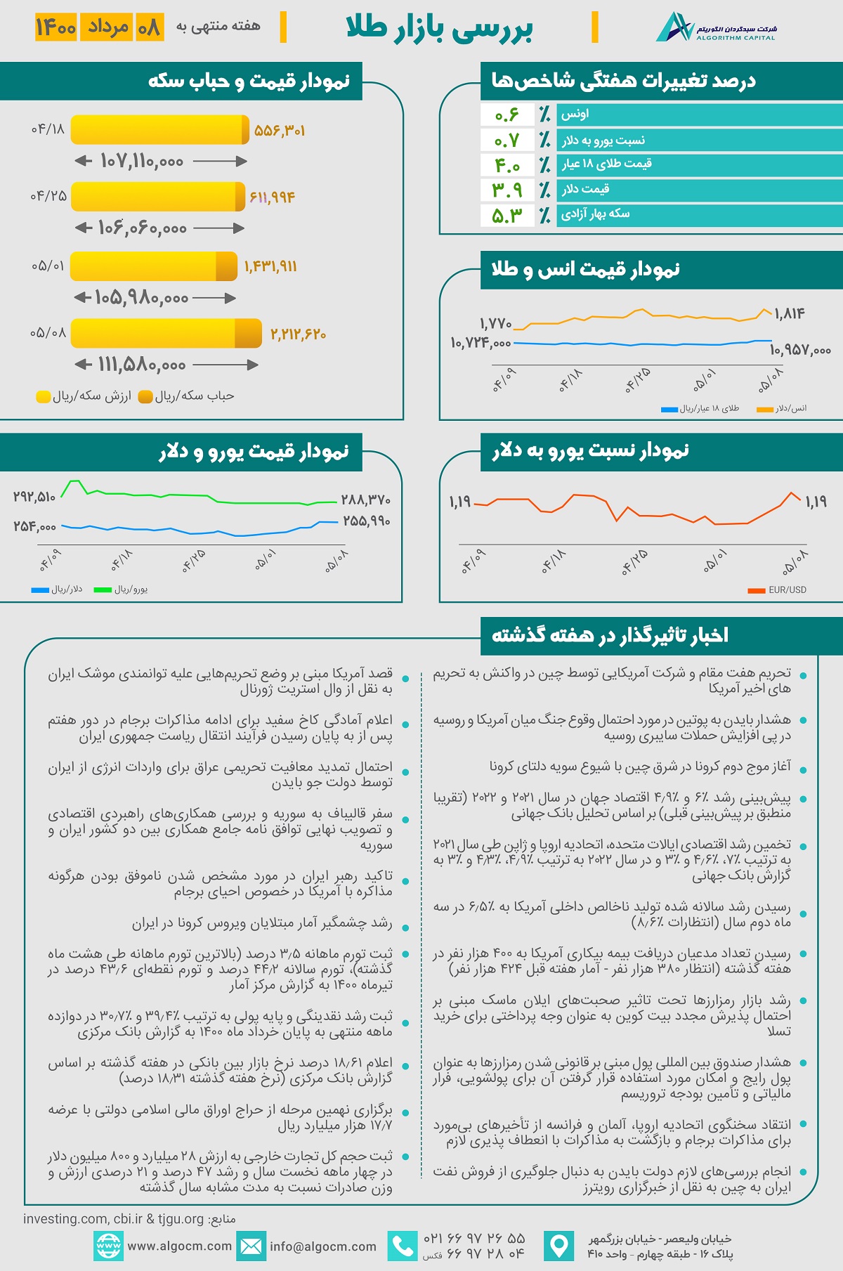 در هفته گذشته اونس جهانی در پی اظهارات رئیس بانک مرکزی آمریکا مبنی بر نیاز بازار اشتغال آمریکا به پشتیبانی و فاصله طولانی تا افزایش نرخهای بهره موجود، با رشد 0.6 درصد در هفته گذشته به رقم 1,814 دلار رسید. بازار ارز و طلا پس تعطیلیهای تهران به دلیل شیوع ویروس کرونا، با افزایش قیمت رو به رو بودند به طوری که هرگرم طلای 18 عیار با افزایش 4 درصدی به رقم 10,957,000 ریال و بهای هر سکه بهار آزادی با افزایش 3.9 درصدی قیمت دلار، با افزایش 5.3 درصدی مواجه بوده و به رقم 111,580,000 ریال در هفته گذشته رسیده است. همچنین حباب سکه با حدود 780 هزار ریال افزایش به 2,212,620 ریال رسیده است.