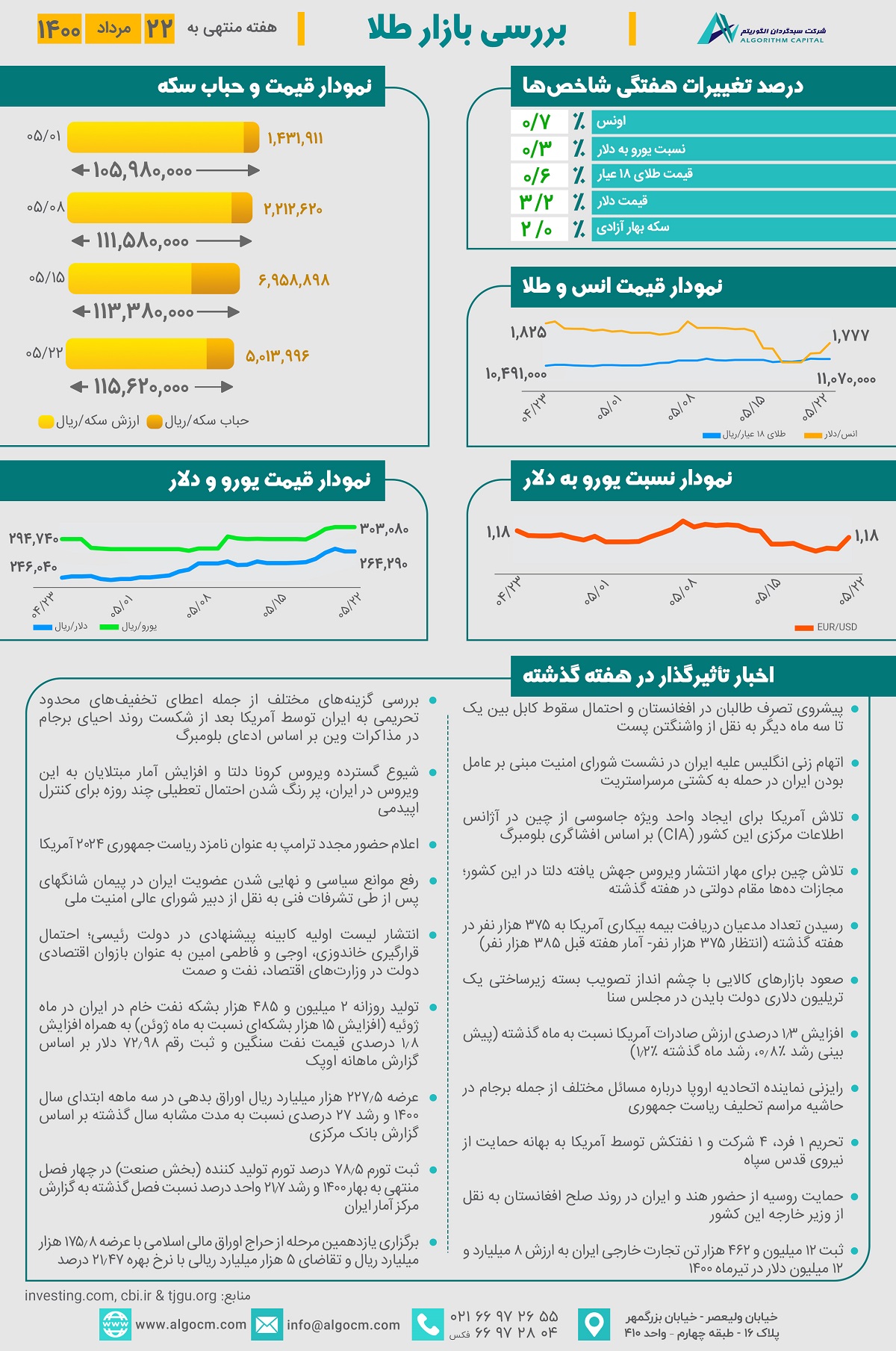 در هفته گذشته اونس جهانی با افزایش 0.7 درصدی به رقم 1,777 دلار رسیده است. هر گرم طلای 18 عیار با افزایش 0.6 درصد به رقم 11,070,000 ریال و بهای هر قطعه سکه بهار آزادی با افزایش 3.2 درصدی قیمت دلار با افزایش 2 درصدی مواجه بوده و به رقم 115,620,000 ریال رسیده است. حباب سکه با کاهش حدود 1,900,000 ریال نسبت به هفته گذشته به رقم 5,013,996 ریال رسیده است.