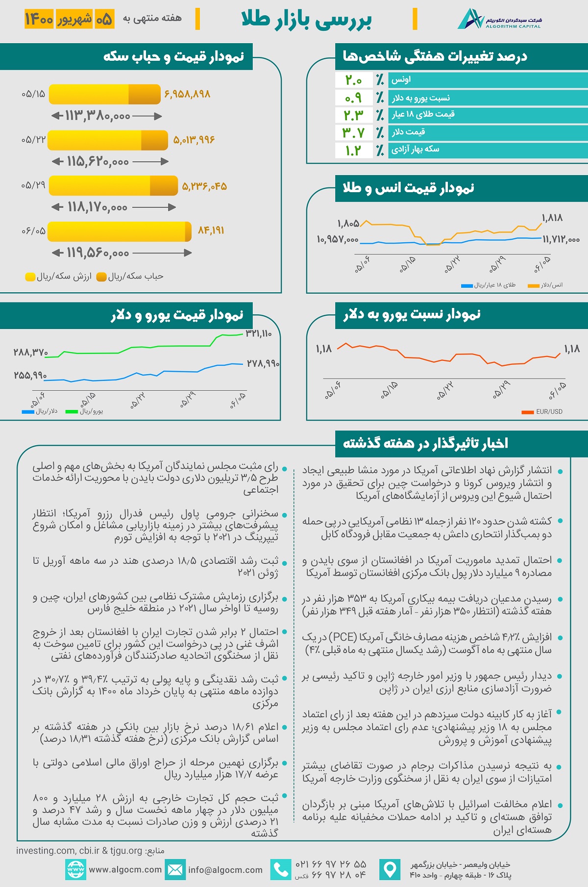 در هفته گذشته اونس جهانی با توجه به اظهارات پاول در جلسه فدال رزرو با افزایش 2 درصدی به رقم 1,818 دلار رسیده است. هر گرم طلای 18 عیار با افزایش 2.3 درصد به رقم 11,712,000 ریال و بهای هر قطعه سکه بهار آزادی با افزایش 3.7 درصدی قیمت دلار با افزایش 1.2 درصدی مواجه بوده و به رقم 119,560,000 ریال رسیده است. حباب سکه نیز از رقم 5,236,045 در هفته گذشته به رقم 84,191 ریال رسیده است.