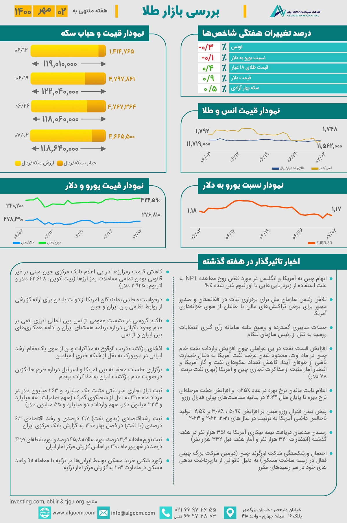 در هفته گذشته اونس جهانی در پی نگرانیها نسبت به مشکلات مالی شرکت اورگرند چین و بیانیه فدرال رزرو در خصوص نرخ بهره با کاهش اندک 0.3 درصدی در هفته گذشته به رقم 1,748 دلار رسید. هر گرم طلای 18 عیار با رشد 0.4 درصدی به رقم 11,562,000 ریال رسیده است. بهای هر قطعه سکه بهار آزادی با افزایش 0.9 درصدی قیمت دلار با رشد 0.5 درصدی مواجه بوده و به رقم 118,640,000 ریال رسیده است. حباب سکه نیز با کاهش 2 درصدی نسبت به هفته گذشته به رقم 4,665,500 ریال رسیده است.