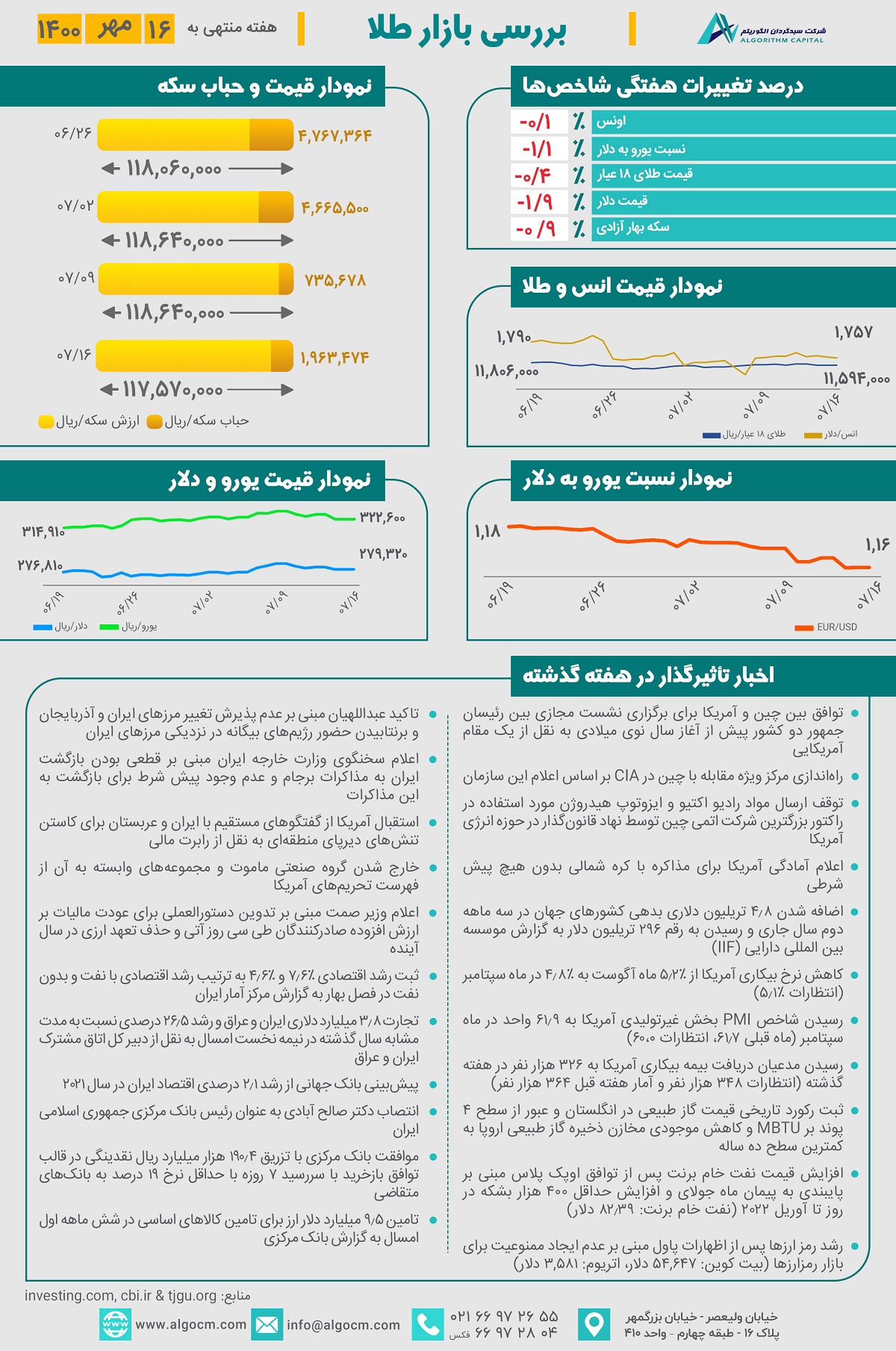 در هفته گذشته اونس تحت تاثیر انتشار آمار اشتغال آمریکا ابتدا اندکی افزایش یافت و پس از آن به سطوح قبلی خود بازگشت و درنهایت با کاهش 0.1 درصدی در هفته گذشته به رقم 1,757 دلار رسید. هر گرم طلای 18 عیار در هفته گذشته با تغییرات چندانی مواجه نبود و با کاهش 0.4 درصدی به رقم 11,594,000 ریال رسیده است. بهای هر قطعه سکه بهار آزادی با توجه به کاهش 1.9 درصدی قیمت دلار، با کاهش 0.9 درصدی مواجه شده و به رقم 117,570,000 رسید. حباب سکه نیز با افزایش 1,220,000 ریالی نسبت به هفته گذشته به رقم 1,963,000 ریال رسیده است.