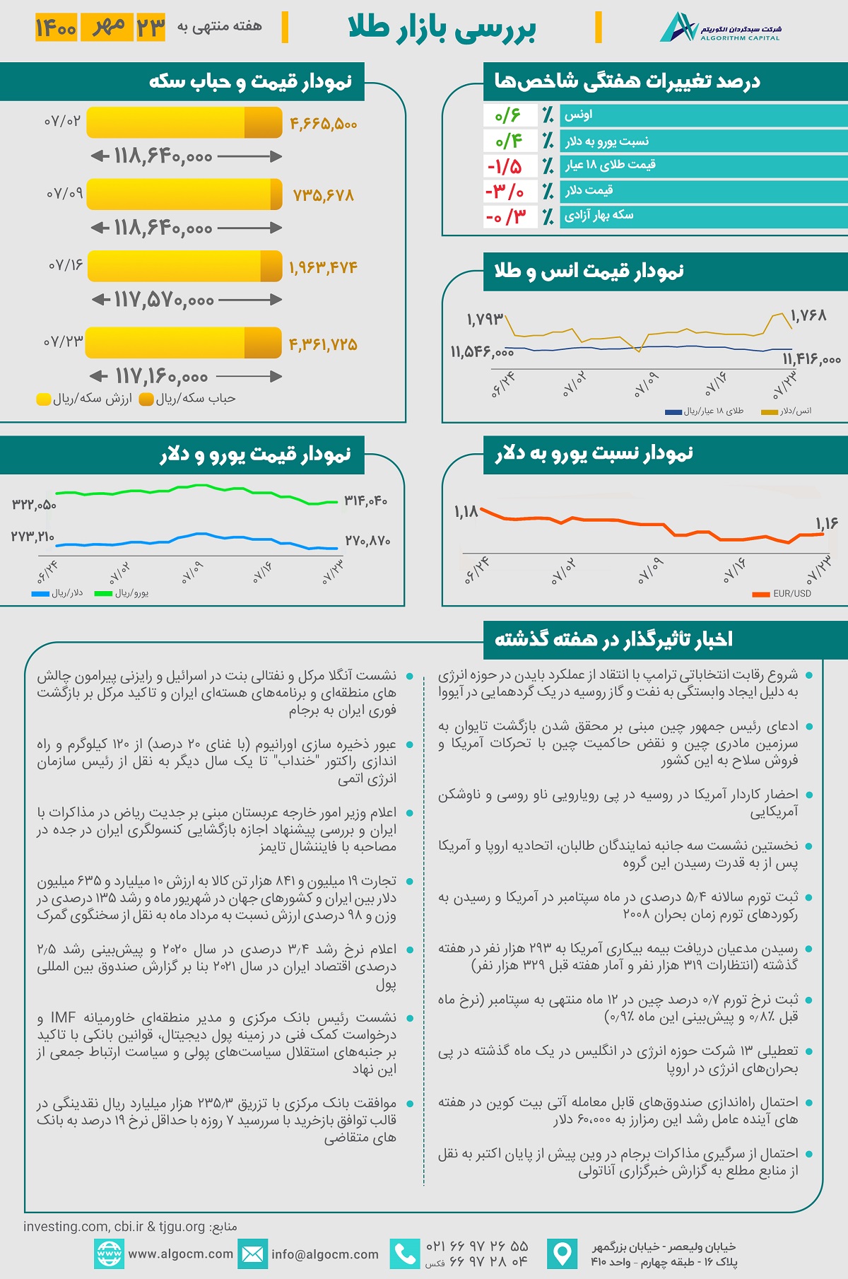 انتشار گزارشهای کلان اقتصادی و تورم آمریکا باعث افزایش تقاضا در طلای جهانی از سوی سرمایهگذاران شد به طوری که در روز پنج شنبه طلا در محدوده نزدیک کانال 1,800دلاری معامله شد اما رشد بازار سهام و بیت کوین مانع ادامه رشد اونس شد و در نهایت با کاهش قیمت در اواخر هفته، قیمت هر اونس طلا به رقم 1,768 دلار رسید. هر گرم طلای 18 عیار با کاهش 1.5 درصدی به رقم 11,416,000 ریال رسیده است. بهای هر قطعه سکه بهار آزادی با توجه به کاهش 3 درصدی قیمت دلار، با کاهش 0.3 درصدی به رقم 117,160,000 رسیده است. حباب سکه نیز به رقم 4,361,000 ریال در هفته گذشته رسید.
