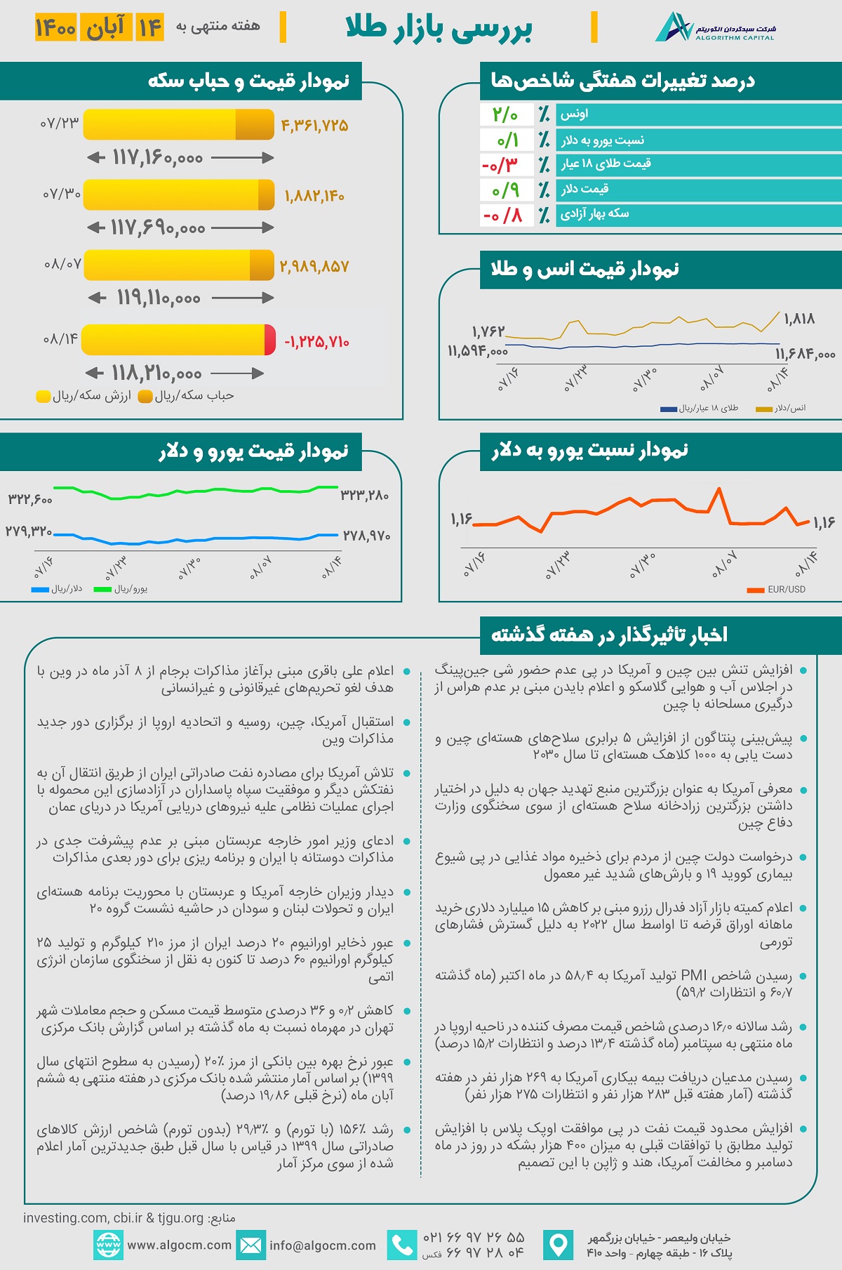 در هفته گذشته اونس تحت تاثیر تصمیم فدرال رزرو مبنی بر کاهش خرید اوراق قرضه، در روز چهارشنبه به رقم 1,764 دلار رسید و پس از آن با کاهش بازده اوراق قرضه توانست به رقم 1,818 دلار برسد و بازده هفتگی 2.0 درصد را به ثبت برساند. با توجه به اخبار مبنی بر شروع دور جدید مذاکرات برجام و برخورد نیروی دریایی سپاه ایران با ناو آمریکایی که از عوامل تغییرات نرخ ارز در هفته گذشته بودند، هر گرم طلای 18 عیار با کاهش نامحسوس 0.3 درصدی به رقم 11,684,000 ریال رسید و همچنین سکه بهار آزادی بر خلاف رشد 0.9 درصدی نرخ ارز با کاهش 0.8 درصدی مواجه شد و به رقم 118,210,000 ریال رسید. حباب سکه نیز در هفته گذشته روند نزولی داشته و بعد از مدتها نرخهای منفی برای این متغیر ثبت شده و به رقم 1,226,000- ریال رسیده است.