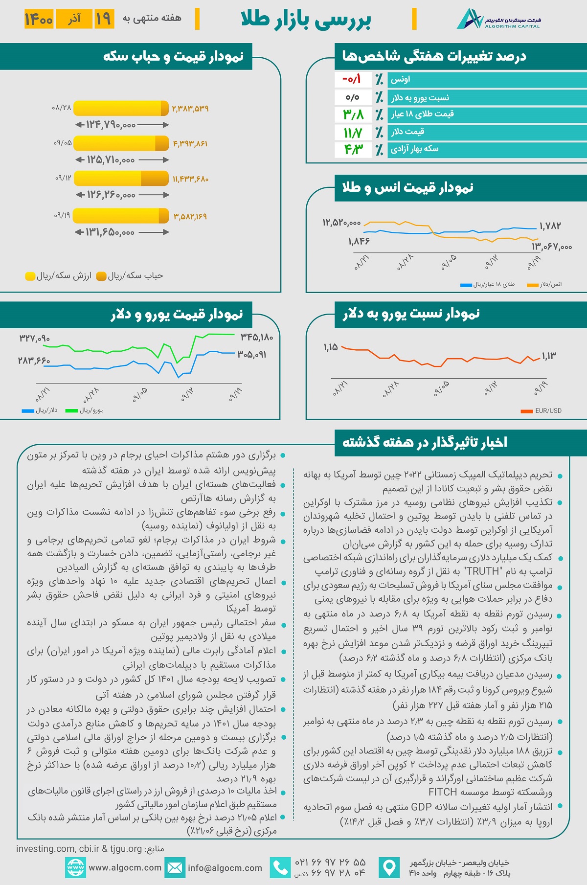 در هفته گذشته طلای جهانی در پی کاهش نگرانیها از شیوع سویه اٌمیکرون ویروس کرونا و آمار منتشر شده از تورم بی سابقه آمریکا با کاهش 0.1 درصد به رقم 1,784 دلار رسید. با توجه به اخبار منتشر شده از نتیجه برگزاری دور هفتم و هشتم مذاکرات وین و اعلام اعضای گروه 1+5 از بالا بودن انتظارات ایران در این نشستها، نرخ دلار در بازار آزاد از نرخ دلار اعلامی در صرافی ملی و بازار متشکل ارزی فاصله گرفت و با رشد 11.7 درصدی در هفته گذشته حدودا به رقم 305,000 ریال رسید. هر گرم طلای 18 عیار با افزایش 3.8 درصدی به رقم 13,067,000 ریال و سکه بهار آزادی نیز با رشد 4.7 درصدی به رقم 131,650,000 ریال رسید. حباب سکه در هفته گذشته به رقم 3,582,000 ریال رسیده است.