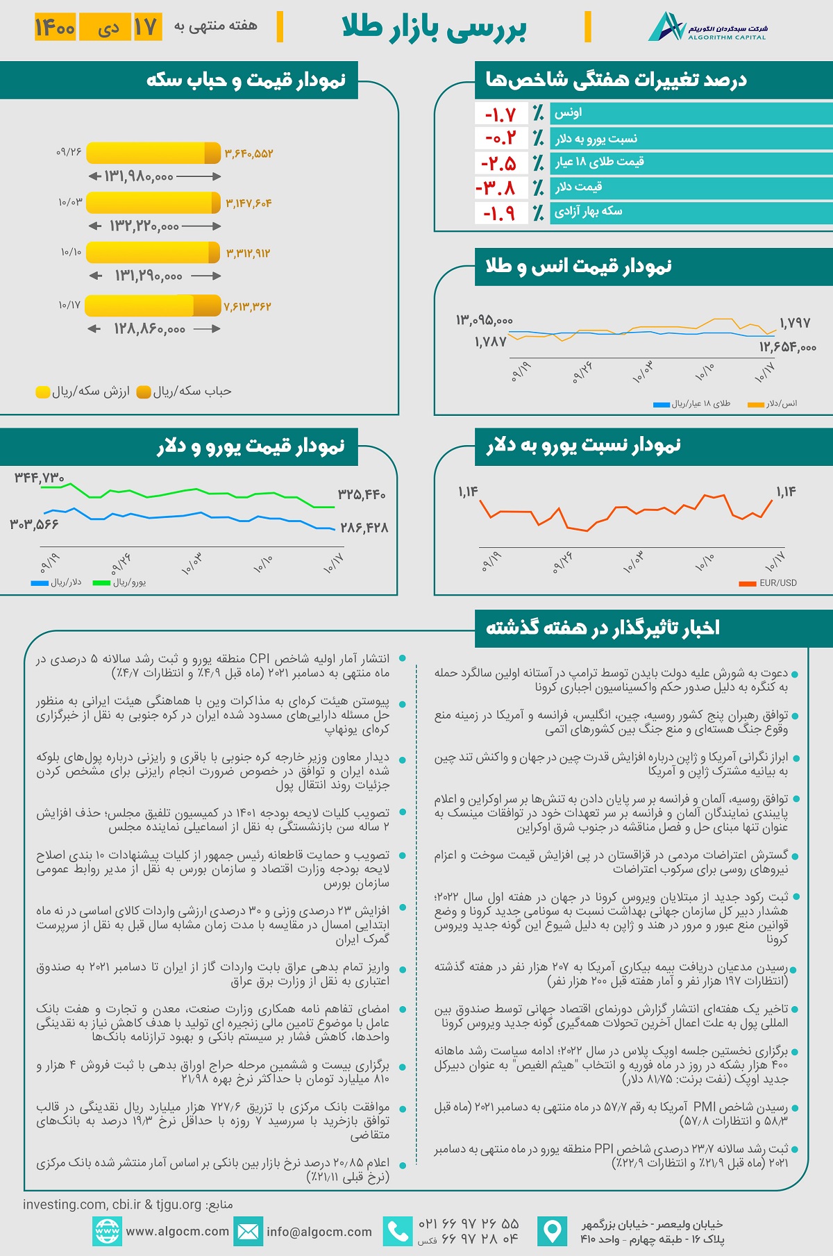 در هفته گذشته با توجه به افزایش گمانه زنیها در مورد افزایش زودتر از موعد نرخ بهره در آمریکا، طلا با نوسانات منفی مواجه شد و با کاهش 1.7 درصدی به رقم 1,797 دلار رسید. با توجه به انتشار اخبار مثبت از نشستهای برجامی، نرخ دلار در بازار آزاد با کاهش 4 درصدی همراه بود و در محدوده 286,000 ریال قرار گرفت. هر گرم طلای 18 عیار تحت تاثیر کاهش نرخ ارز و طلای جهانی با کاهش 2.5 درصدی به رقم 12,654,000 ریال و سکه بهار آزادی نیز با کاهش 1.9 درصدی به رقم 128,860,000 ریال رسید. با توجه به کاهش ارزش ذاتی سکه بهار آزادی و افزایش انتظارات از کاهش قیمتها، حباب سکه به 7,613,000 ریال افزایش یافت.
