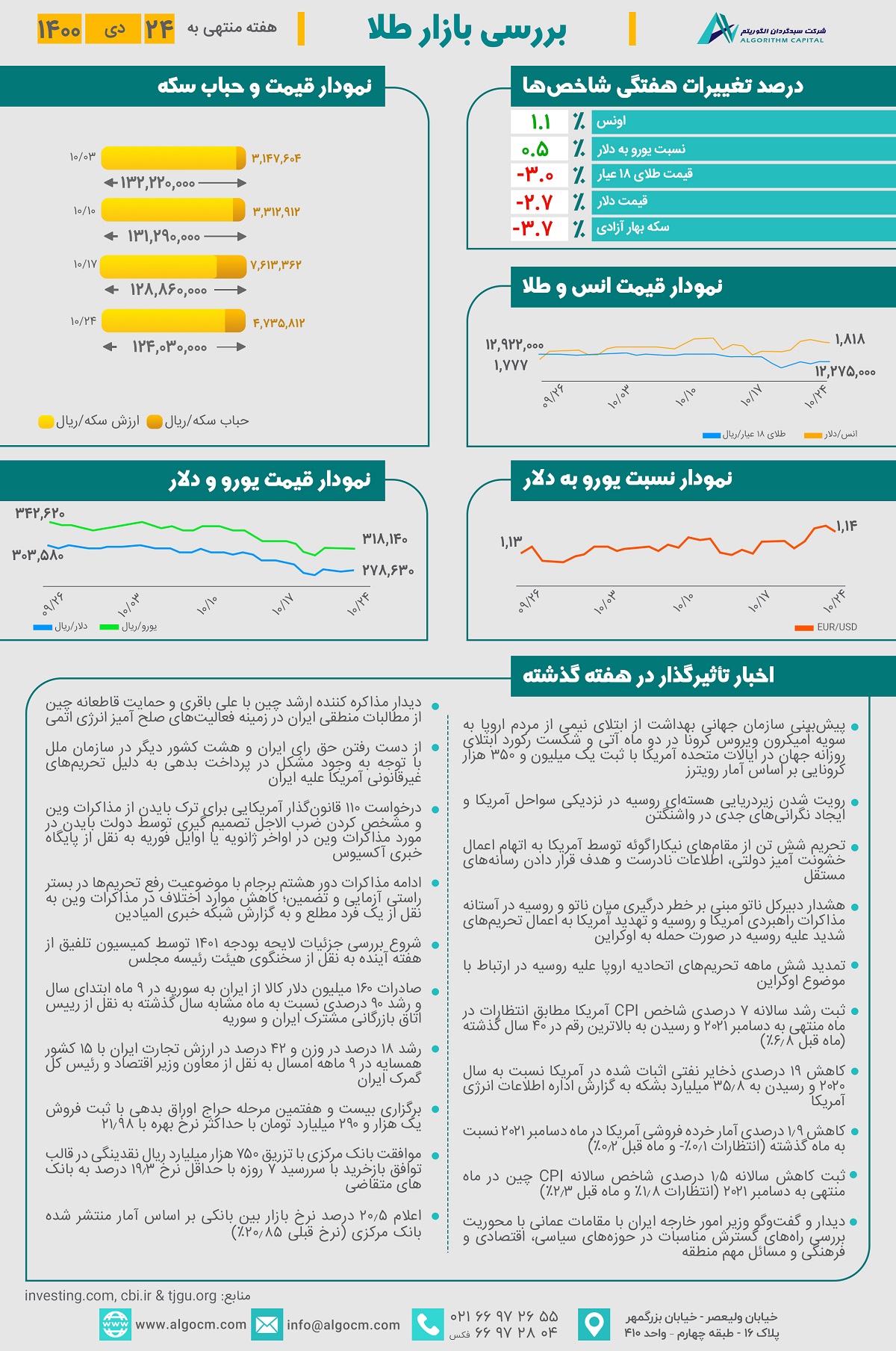 در هفته گذشته طلای جهانی در پی انتشار آمار اقتصادی آمریکا و کاهش شاخص دلار با رشد 1.1 درصدی همراه بود و به رقم 1,818 دلار رسید. با توجه به اخبار مثبت از مذاکرات برجام نرخ دلار در بازار آزاد با کاهش همراه بود و در محدوده 278,000 ریال قرار گرفت. هر گرم طلای 18 عیار و سکه بهار آزادی با توجه به نوسانات کاهشی نرخ ارز به ترتیب با کاهش 3% و 4% در هفته گذشته همراه بود. حباب سکه نیز با کاهش 2,780,000 ریالی نسبت به هفته قبل به رقم 4,735,000 ریال رسید.