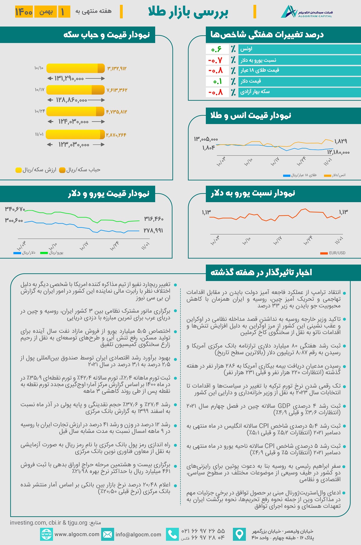 در هفته گذشته طلای جهانی در پی انتشار آمار اشتغال آمریکا و کاهش شاخص دلار با رشد 0.6 درصدی همراه بود و به رقم 1,829 دلار رسید. نرخ دلار در بازار آزاد نیز با نوسانات محدود صعودی همراه بود و روند کاهشی آن در هفته گذشته متوقف شد. طلای 18 عیار با کاهش 0.8 درصدی به رقم 12,180,000 ریال رسید و سکه بهار آزادی نیز با کاهش 0.8 درصدی به رقم 123,030,000 ریال رسید. حباب سکه با کاهش 1,860,000 ریالی نسبت به هفته قبل به رقم 2,870,000 ریال رسید.