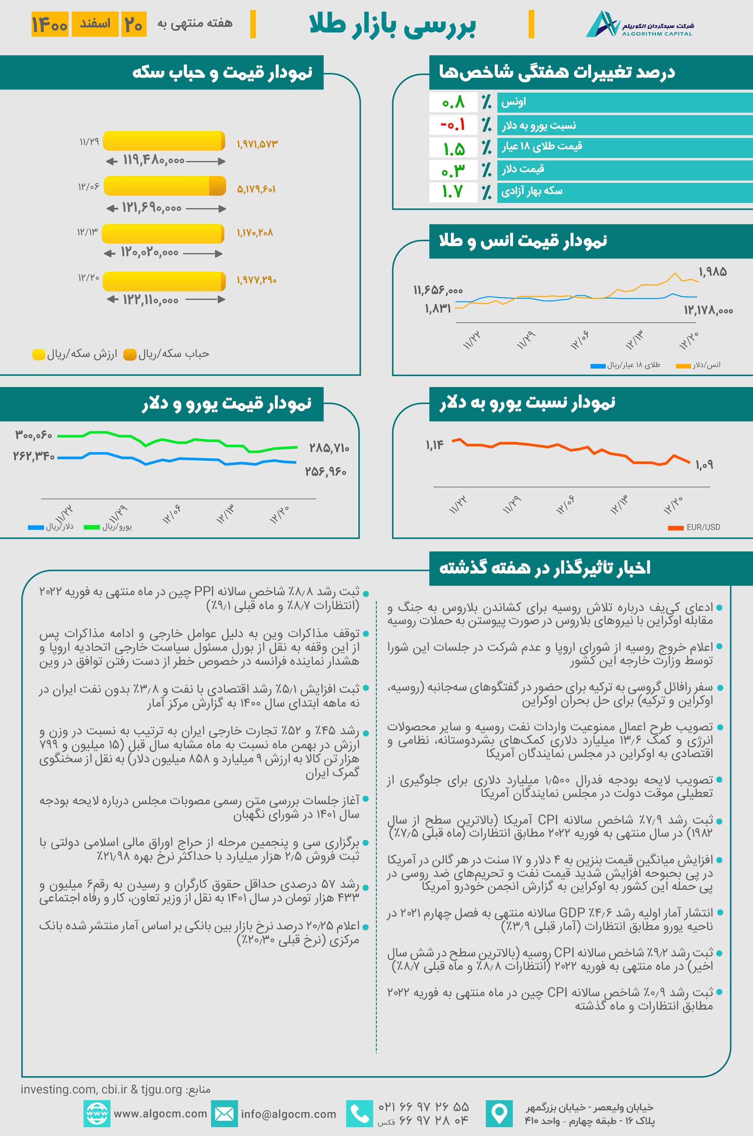 اونس طلا در روز سه شنبه به بالاترین سطح در 19 ماهه اخیر رسید و رقم 2,068 دلار را ثبت نمود. کارشناسان براین باورند که وجود تنش بین اوکراین و روسیه را از عوامل اصلی رشد طلای جهانی بوده است. در روز پنجشنبه با توجه به انتشار آمار اقتصادی آمریکا و رشد بیسابقه تورم در این کشور، گمانه زنیها برای افزایش نرخهای بهره توسط فدرال رزرو افزایش یافت و اونس طلا با کاهش 83 دلاری به رقم 1,985 دلار رسید. بازار ارز در هفته گذشته با نوسانات محسوسی رو به رو نبوده است. با توجه به افزایش قیمت اونس، هر گرم طلای 18 عیار و سکه بهار آزادی به ترتیب با رشد هفتگی 1.5% و 1.7% رو به رو بوده اند و حباب سکه نیز با افزایش 807,000 ریال به رقم 1,977,000 ریال رسید.