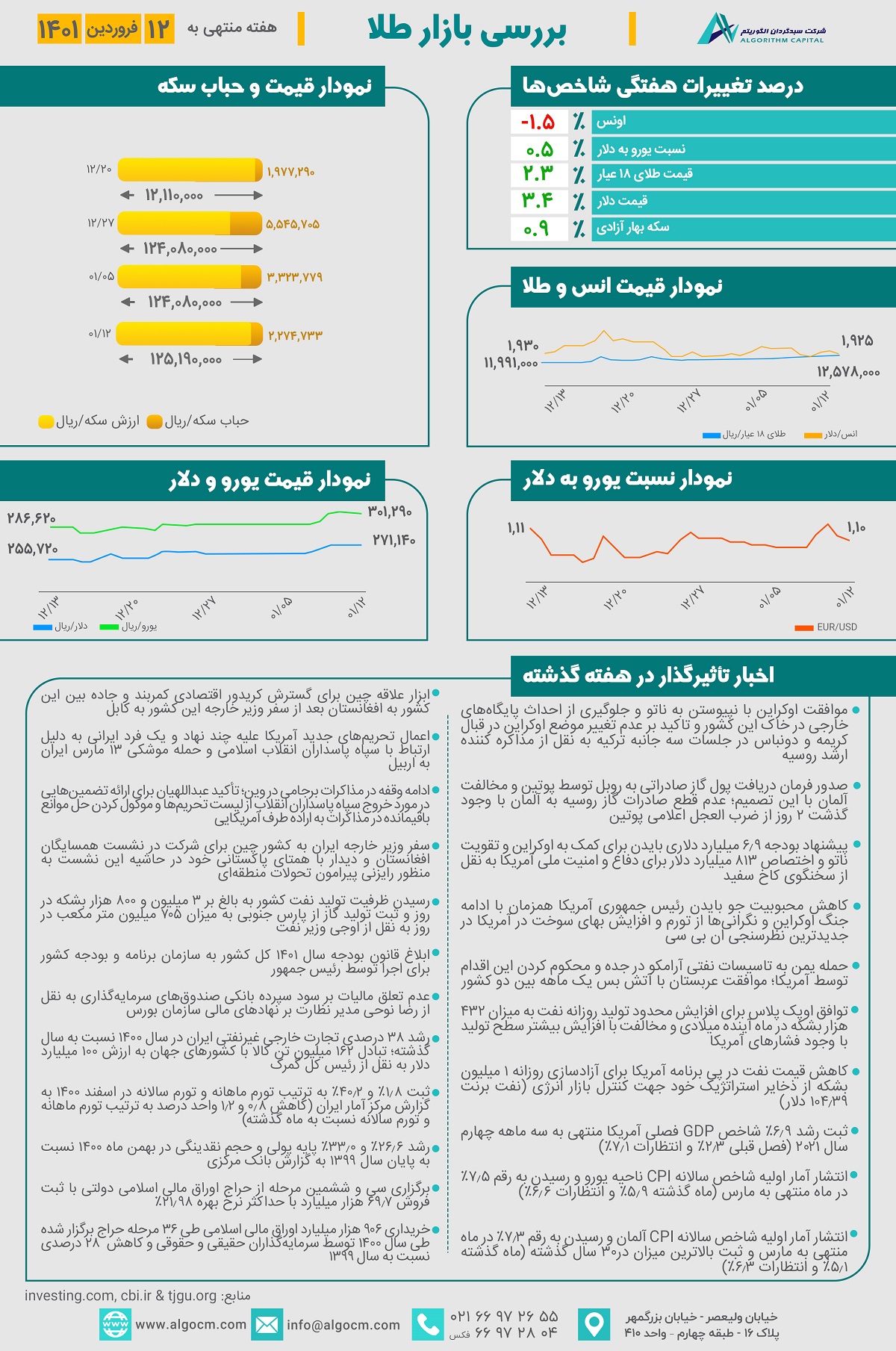 با توجه به پیشرفت مذاکرات صلح روسیه و اوکراین و کاهش تنش میان این دو کشور، تقاضای سرمایهگذاران برای خرید طلا به عنوان یک دارایی امن کاهش یافته است. در نتیجه اونس طلا با کاهش 1.5 درصدی در هفته گذشته همراه بود و به رقم 1,925 دلار رسید. در پی وقفه طولانی مذاکرات برجامی و کاهش انتظارات از حصول توافق، بازار ارز با روند صعودی همراه شد و نرخ دلار با رشد 3.4 درصد حدودا به رقم 270,000 ریال رسید. با توجه به نوسانات افزایشی بازار ارز، هر گرم طلای 18 عیار و سکه بهار آزادی به ترتیب با رشد هفتگی 2.3% و 0.9% رو به رو بودهاند و حباب سکه نیز روند کاهشی داشته و به رقم 2,274,000 ریال رسید.