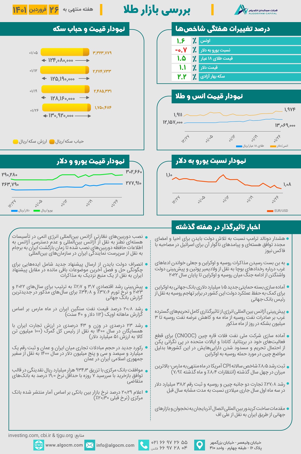 در اوایل هفته گذشته باتوجه به اخبار سیاسی و توقف طولانی مذاکرات برجام، بازار ارز روند صعودی طی کرد و نرخ دلار به رقم 280,000 ریال رسید و در ادامه اندکی از این التهابات کاهش یافت و قیمت دلار مجدداً به کانال 270,000 ریال بازگشت و رشد 1.1 درصدی را ثبت نمود. با توجه به نوسانات افزایشی بازار ارز و رشد طلای جهانی، هر گرم طلای 18 عیار و سکه بهار آزادی به ترتیب با رشد هفتگی 1.5% و 2.2% رو به رو بودند. حباب سکه نیز با کاهش حدودی 735 هزار ریالی نسبت به هفته گذشته به رقم 1,750,000 ریال رسید.