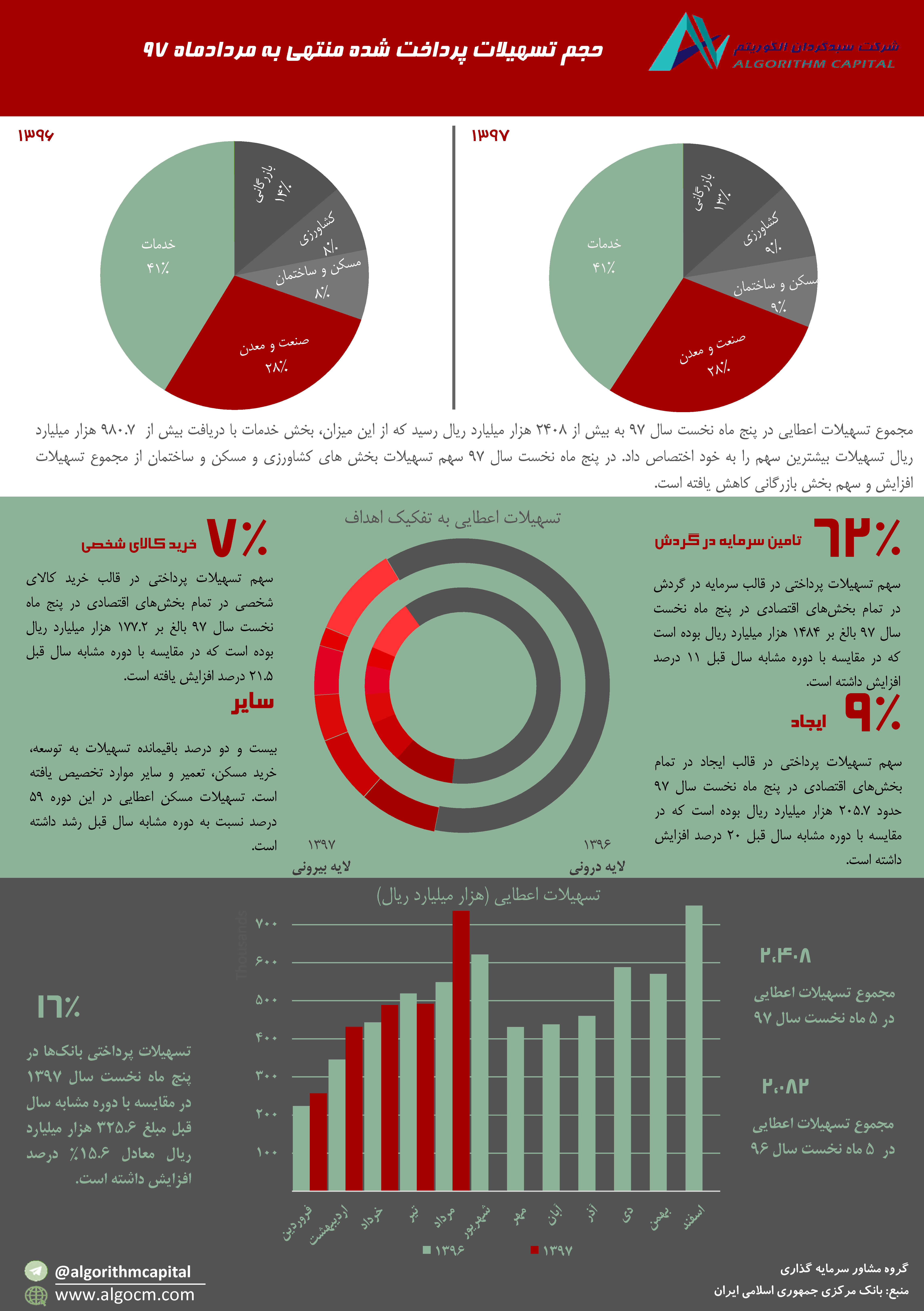اینفوگرافیک مجموع تسهیلات اعطایی در پنج ماه نخست سال ۹۷ با ۱۵.۶% رشد نسبت به مدت مشابه سال قبل به بیش از ۲۰۴۸ هزار میلیارد ریال رسید.