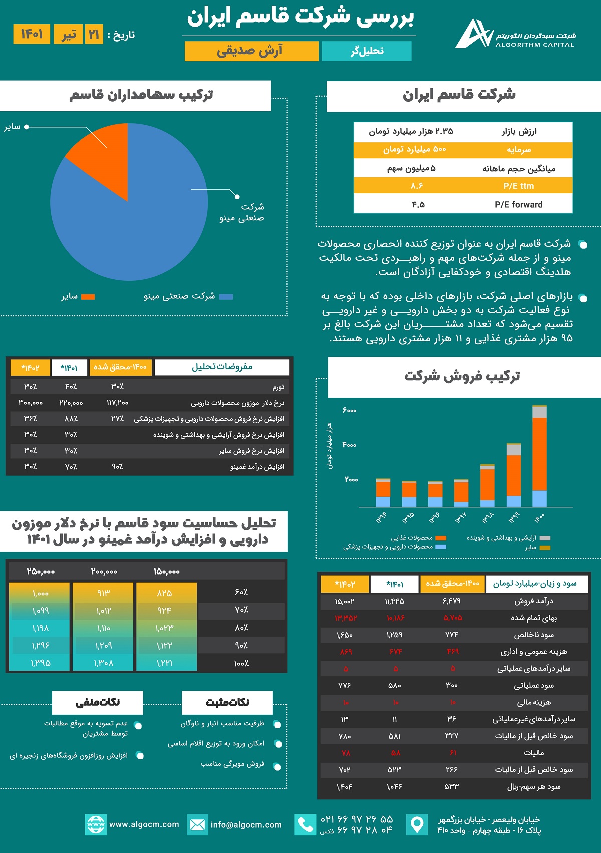 شرکت قاسم ایران بعنوان توزیع کننده انحصاری محصولات مینو و از جمله شرکتهای مهم و راهبردی تحت مالکیت هلدینگ اقتصادی و خودکفایی آزادگان است ، بیش از 62 سال تجربه فعالیت در زمینه ی توزیع و پخش مویرگی محصولات تولیدی کارخانجات کشور را در کارنامه خود دارد . بازارهای اصلی شرکت بازارهای داخلی کشور بوده که با توجه به نوع فعالیت شرکت به دو بخش دارویی و غیر دارویی تقسیم می شود که تعداد مشتریان این شرکت بالغ بر 95 هزار مشتری غذایی و 11 هزار مشتری دارویی هستند.