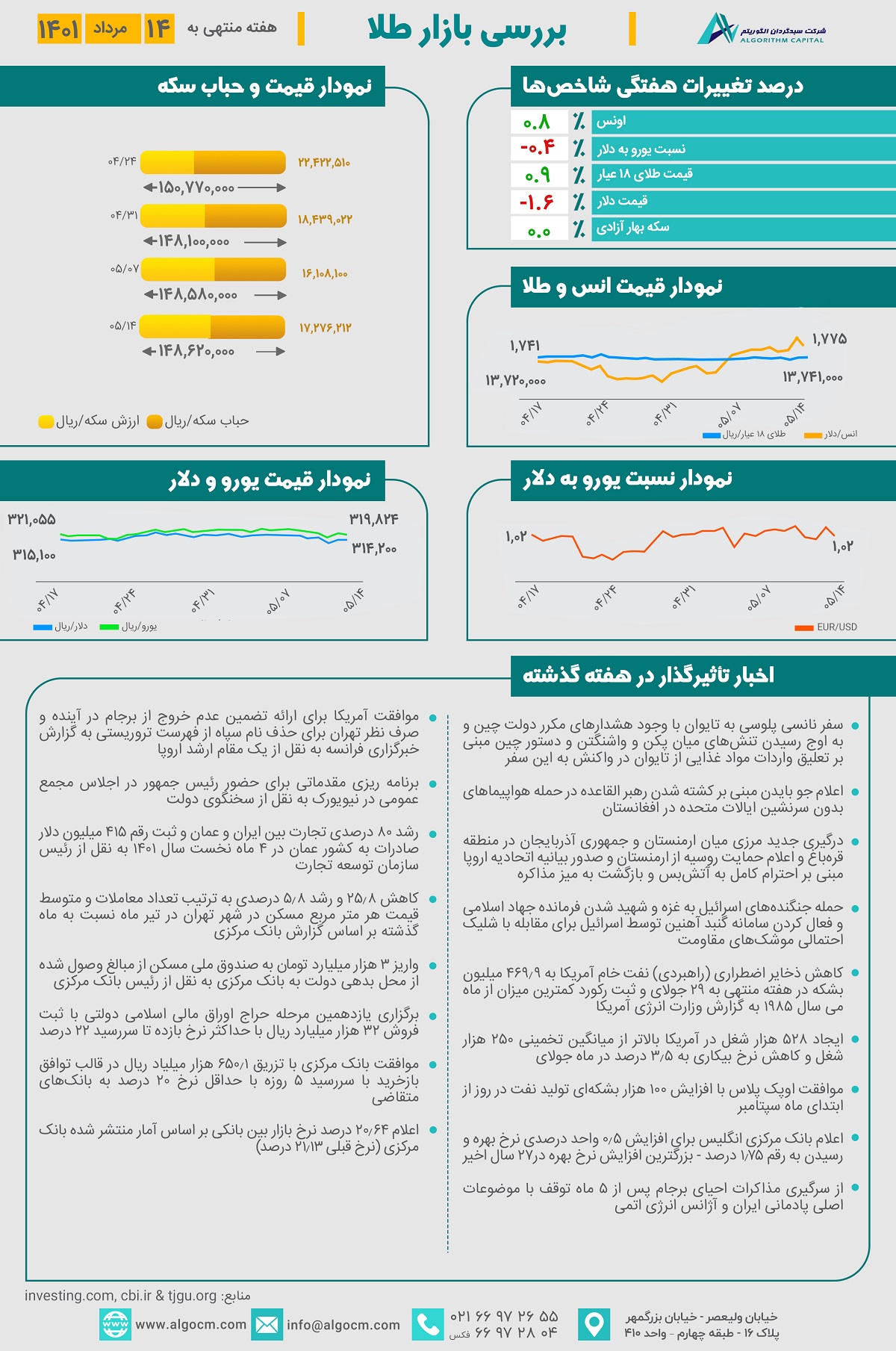 در ابتدای هفته گذشته با توجه به افزایش درگیریهای میان پکن و واشنگتن اونس طلا با روند افزایشی همراه بود و در انتهای هفته با انتشار آمار اقتصادی و رشد شاخص دلار با کاهش همراه بوده است. در نهایت با ثبت رشد 0.8 درصد در هفته گذشته به رقم 1,775 دلار رسید. با توجه به شروع مجدد مذاکرات برجام و افزایش خوشبینیها نسبت به حصول توافق، بازار ارز با نوسانات نزولی همراه بوده و نرخ دلا با کاهش 1.6 درصدی به رقم 314,000 ریال رسید. هر گرم طلای 18 عیار نیز با رشد 0.9 درصدی در هفته گذشته به رقم 13,740,000 ریال رسید. سکه بهار آزادی نیز بدون تغییر نسبت به هفته گذشته باقی ماند. حباب سکه نیز با تغییر نامحسوس نسبت به هفته گذشته به رقم 17,270,000 ریال رسید.