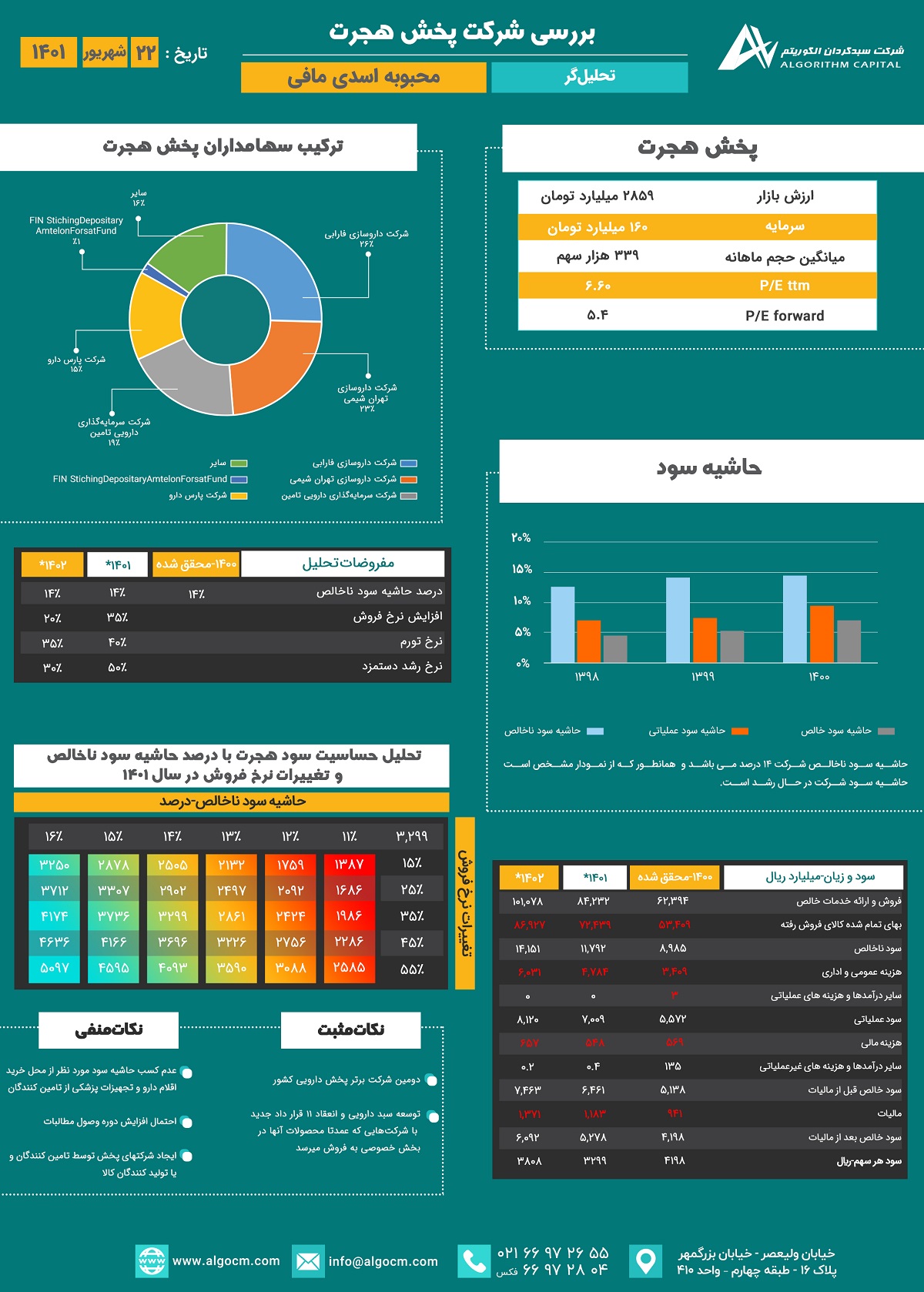 شرکت پخش هجرت در سال 1344 با نام “تهران فارما” آغاز به کارکرد. نام شرکت در 18 فروردین 1363 به “پخش هجرت” تغییر یافت. درحال حاضر جزء واحدهاي تجاري فرعی شرکت سرمایه گذاري دارویی تأمین (فرعی شرکت سرمایه گذاري تأمین اجتماعی) است و واحد تجاري نهایی گروه سازمان تأمین اجتماعی است. موضوع فعالیت اصلی شرکت خرید و فروش هرگونه مواد و محصولات دارویی بوده است. براساس اطلاعات آمارنامه دارویی کل کشور در سال 1397 ،شرکت پخش هجرت دومین پخش بزرگ دارویی ایران است . تعداد مشتریان بخش خصوصی شرکت در سراسر کشور بیش از 12.287 داروخانه می باشد که با افزودن مراکز درمانی دولتی، دانشگاه علوم پزشکی، سازمان تأمین اجتماعی، آزمایشگاهها، پلی کلینیکها، انبارهاي دارویی، تجهیزات پزشکی و مراکز ترك اعتیاد، این رقم به بیش از 14,229 مشتري می رسد.