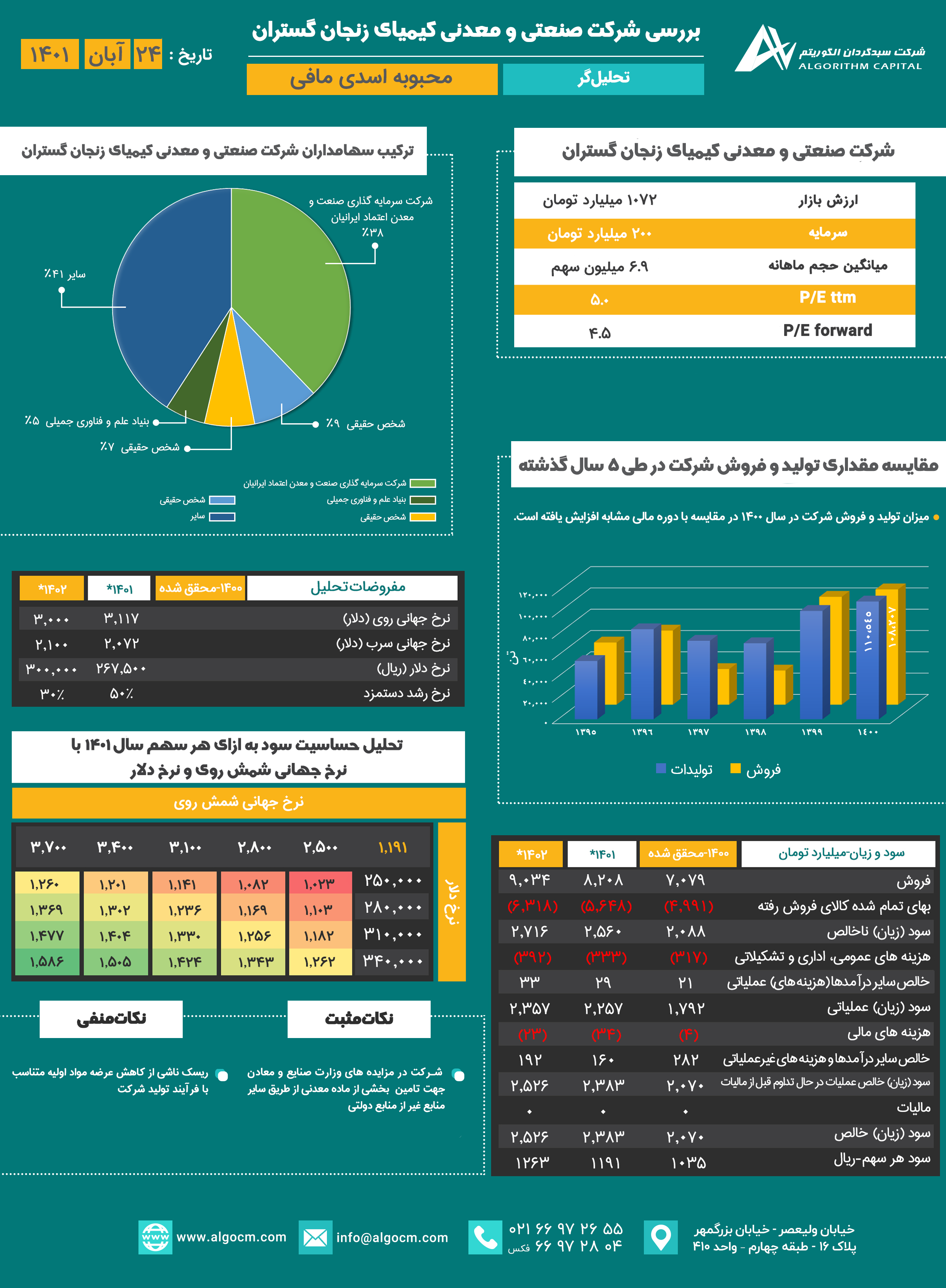 شرکت صنعتی و معدنی کیمیای زنجان گستران با هدف تولید کنسانتره سرب و روی در راستای تأمین نیاز بازارهای داخلی و دستیابی به بازارهای بین المللی در سال ۱۳۸۶ تأسیس شد. از مشخصات بارز این شرکت بهره گیری از آخرین تکنولوژی روز دنیا، ارتباط بهینه با کارشناسان مجرب و کاهش ضایعات تولید و افزایش راندمان می باشد. ظرفیت اسمی این شرکت ۲۵۰ هزار تن کنسانتره روی و ۵۰ هزار تن کنسانتره سرب می باشد . این شرکت کنسانتره روی مورد نیاز بیش از ۲۴ کارخانه تولید کننده شمش را تولید و تأمین می نماید.