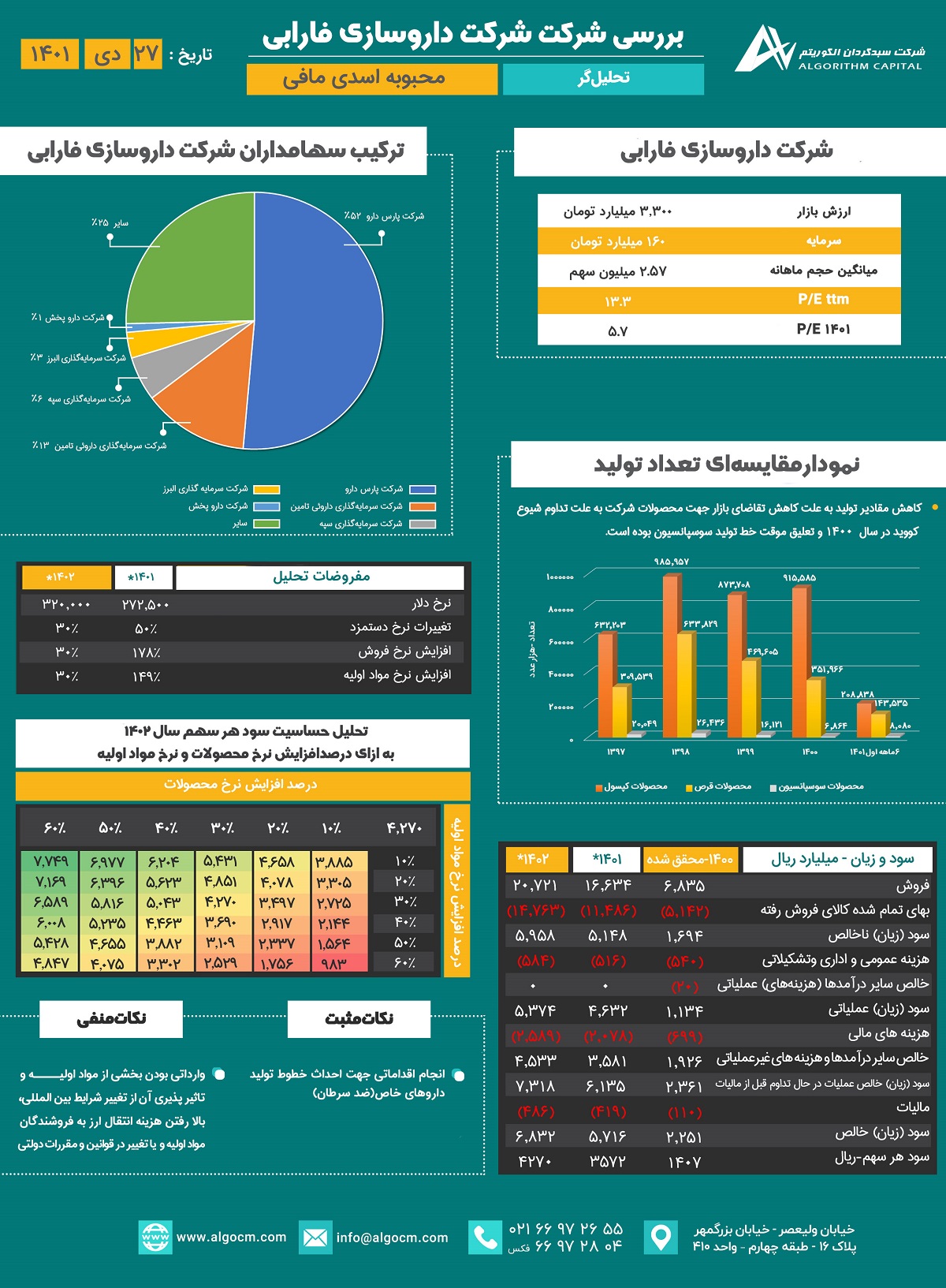 شرکت داروسازی فارابی به منظور تولید انبوه فرآوردههای دارویی احـداث و در دیماه سال ۱۳۷۱ مورد بهره برداری قرار گرفته است. این شرکت در 27 اسفند 1374 در بورس اوراق بهادار تهران پذیرفته شد. گروه شامل شرکت داروسازی فارابی و شرکت فرعی آن شرکت تولید ژلاتین کپسول ایران می باشد . داروسازی فارابی تولید کننده انواع فرآوردههای دارویی و مکمل های رژیمی-غذایی است. سه گروه عمده فرآوردههای دارویی تولید شده در شرکت داروسازی فارابی شامل: انواع فرآوردههای دارویی آنتیبیوتیک خوراکی، انواع فرآورده های دارویی غیرآنتیبیوتیک خوراکی و انواع مکملهای رژیم غذایي ميباشد.