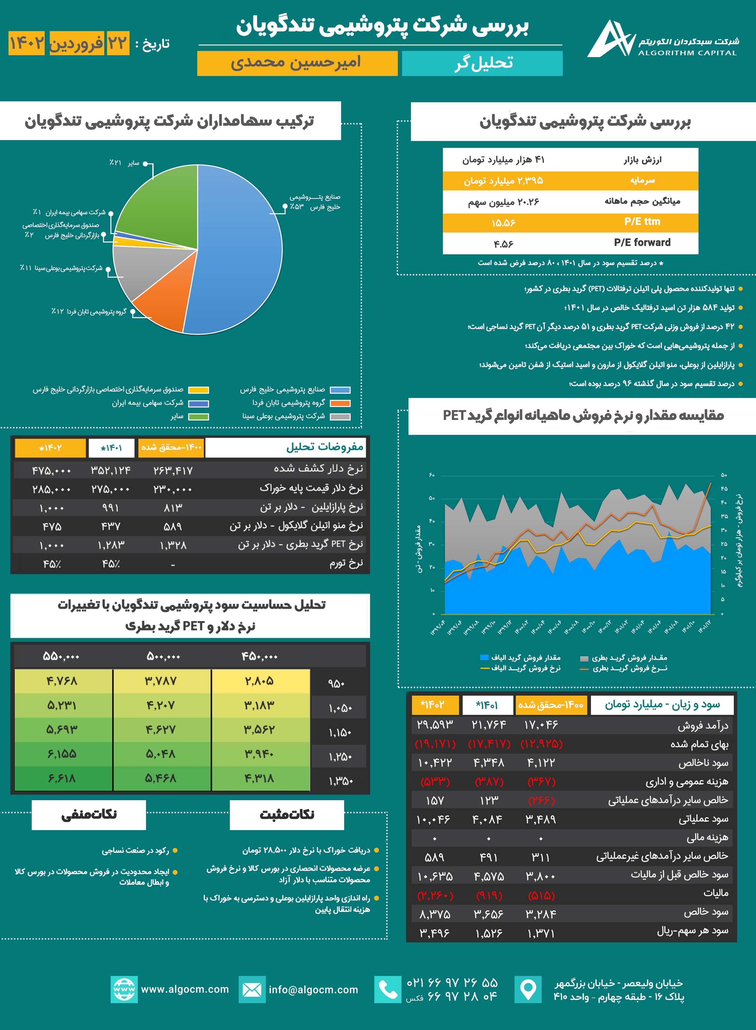 پتروشیمی تندگویان تنها تولیدکننده محصولات PET در کشور است. صنایع پتروشیمی خلیج فارس با ۵۳ درصد، سهامدار عمده شگویا میباشد. پارازایلین و MEG از جمله مواد اولیه مورد مصرف پتروشیمی تندگویان هستند....
