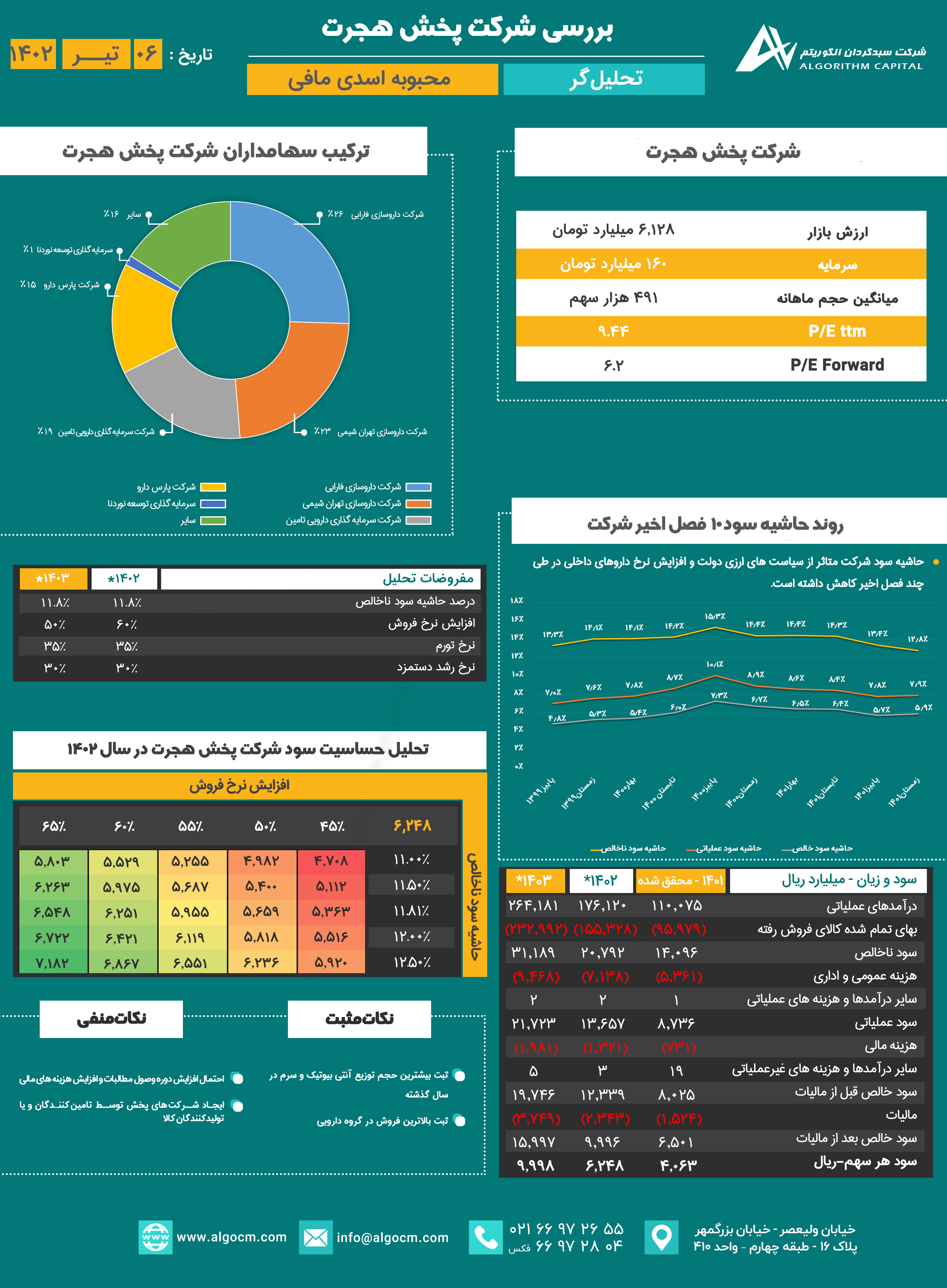 شرکت پخش هجرت کار خود را با نام "تهران فارما" با واردات، توزیع و فروش کالای دارویی، آزمایشگاهی و بهداشتی آغاز کرد. این شرکت درحال حاضر جزء واحدهای تجاری فرعی شرکت سرمایهگذاری دارویی تأمین (فرعی شرکت سرمایهگذاری تأمین اجتماعی) است و واحد تجاری نهایی گروه سازمان تأمین اجتماعی است. شرکت پخش هجرت ارائهدهنده خدمات توزیع و فروش دارو، تجهیزات پزشکی، مکملهای غذایی و محصولات بهداشتی میباشد.