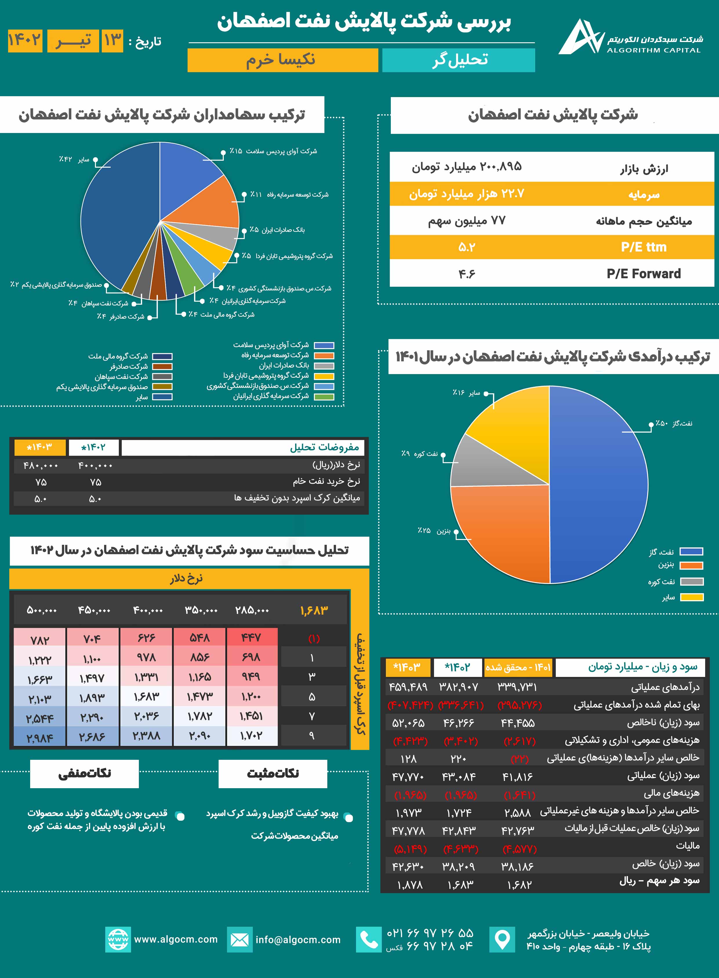 پالایشــگاه اصفهــان اولیــن پالایشــگاه کشــور از نظــر تنــوع تولیــد فرآوردههــای نفتــی محســوب می¬شــود. نفت خام مورد نیاز پالایشگاه از حوزه نفتی مارون، تأمین میگردد. بر اساس گزارشها در سال ۱۴۰۱ این شرکت با ظرفیت پالایش ۳۳۷ بشکه در روز از نظر دریافت خوراك نفت خام و میعانات گازی در جایگاه سوم و از منظر تولید محصولات نفتگاز مقام نخست، گاز مایع مقام دوم، نفت كوره مقام سوم، بنزین مقام چهارم و نفت سفید در مقام پنجم قرار دارد. این شرکت روزانه حدود ۴ میلیون لیتر گازوئیل یورو ۴و ۵ تولید میکند و با بهرهبرداری از واحد تصفیه گازوئیل که در سال ۱۴۰۲ محقق میشود نیز تمام ۲۰ میلیون لیتر گازوئیل تولیدی این شرکت، یورو ۵ خواهد شد و روزانه ۳۰۰ تن گوگرد نفتگاز تولیدی حذف میشود.