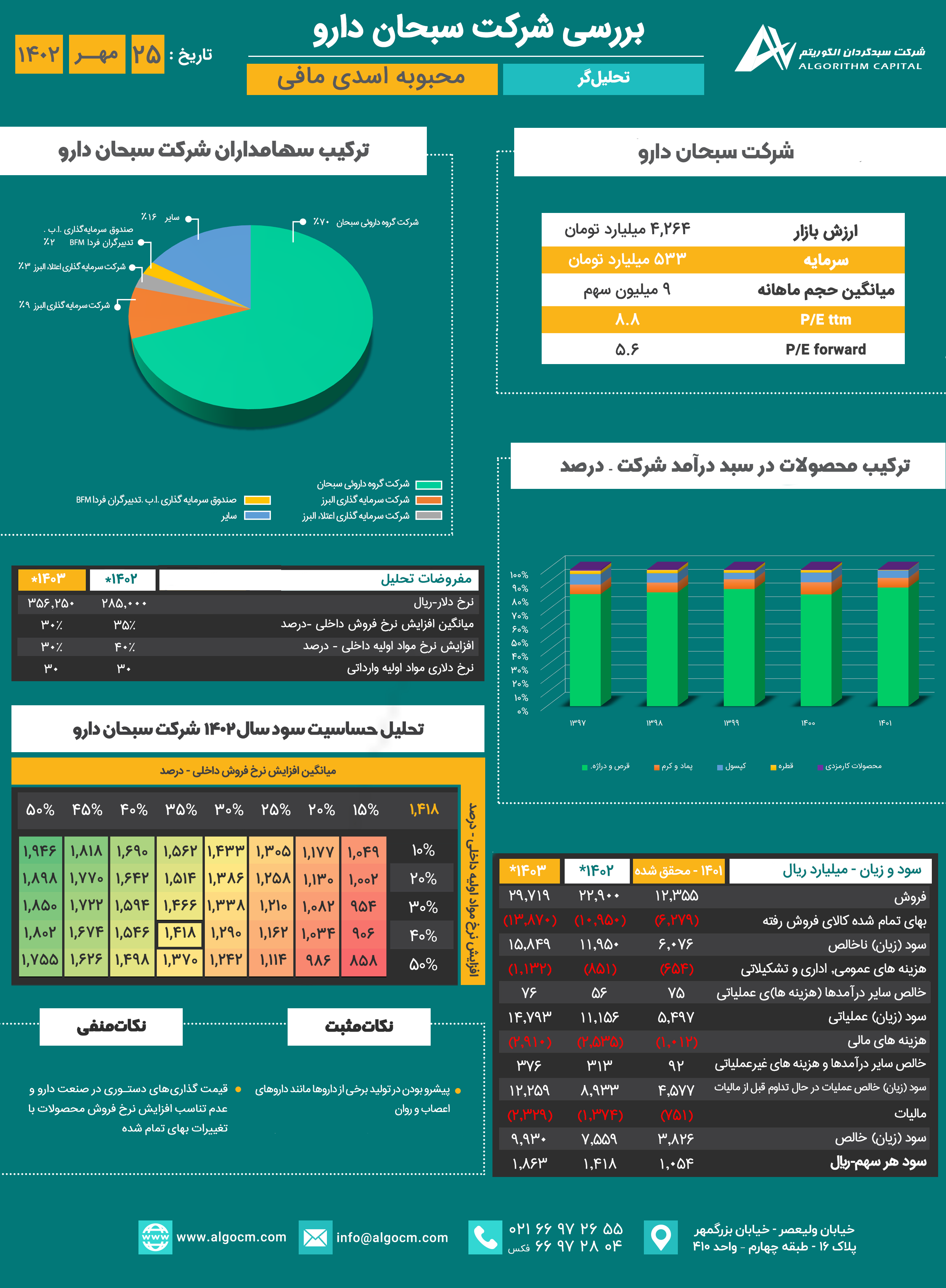 شرکت سبحاندارو، به عنوان بزرگترین تولیدکننده عددی و پیشرو در تولید داروهای اعصاب و روان در کشور میباشد. در حال حاضر این شرکت جز، واحدهای تجاری فرعی شرکت گروه دارویی سبحان است و واحد تجاری نهایی گروه، شرکت سرمایهگذاری البرز میباشد. شرکت محصولات خود را در اشکال قرص و دراژه، کپسول، پماد، کرم ، قطره و ... به بازار دارویی عرضه مینماید. عمده فروش محصولات سبحان دارو در بازار داخلی میباشد و کمتر از ۲ درصد درآمد شرکت از محل صادرات است.