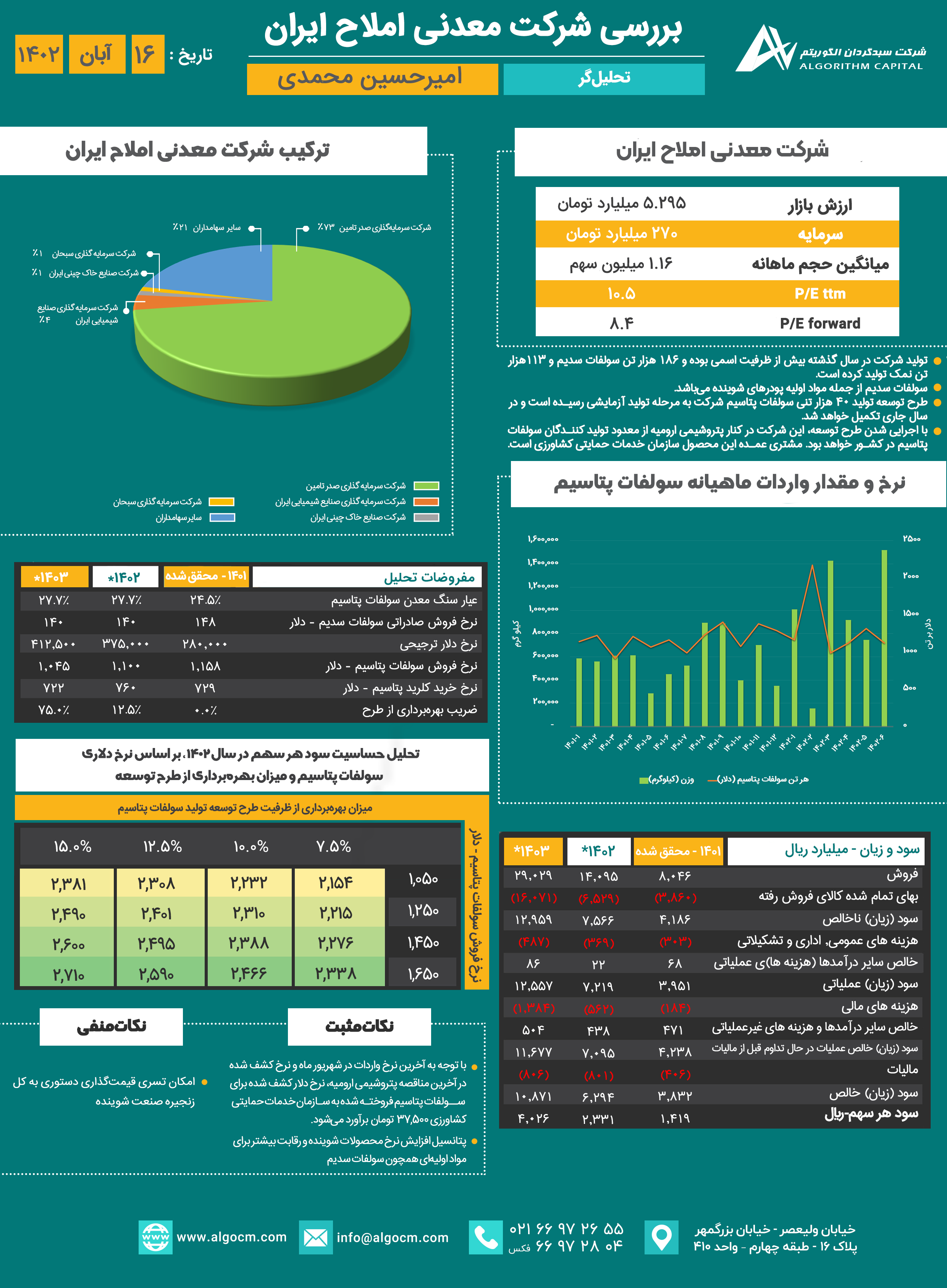 شرکت معدنی املاح ایران در سال ۱۳۶۳ با هدف اکتشاف، استخراج و فرآوری نمکهای صنعتی بخصوص سولفات سدیم و کلرور سدیم تاسیس شد. این شرکت در سال ۱۳۷۵ در سازمان بورس اوراق بهادار تهران پذیرفته شد و به شرکت سهامی عام تبدیل گردید. این شرکت دارای دو سایت مجزا است و مجتمع شماره یک شرکت در گرمسار و مجتمع شماره دو شرکت در اراک جاده میقان میباشد. شرکت معدنی املاح ایران تنها شرکت دارنده مجوز استاندارد ملی سولفات سدیم در ایران میباشد و بزرگترین تولیدکننده سولفات سدیم خاورمیانه و همچنین داخل کشور میباشد و به عبارتی نزدیک به ۷۰-۸۵درصد از سولفات سدیم مورد نیاز کشور را تامین میکند. از مهمترین مصرف کنندگان سولفات سدیم میتوان به شرکتهای تولید کننده پودر شوینده ، شرکتهای شیشه سازی ، داروسازی و ... اشار کرد.