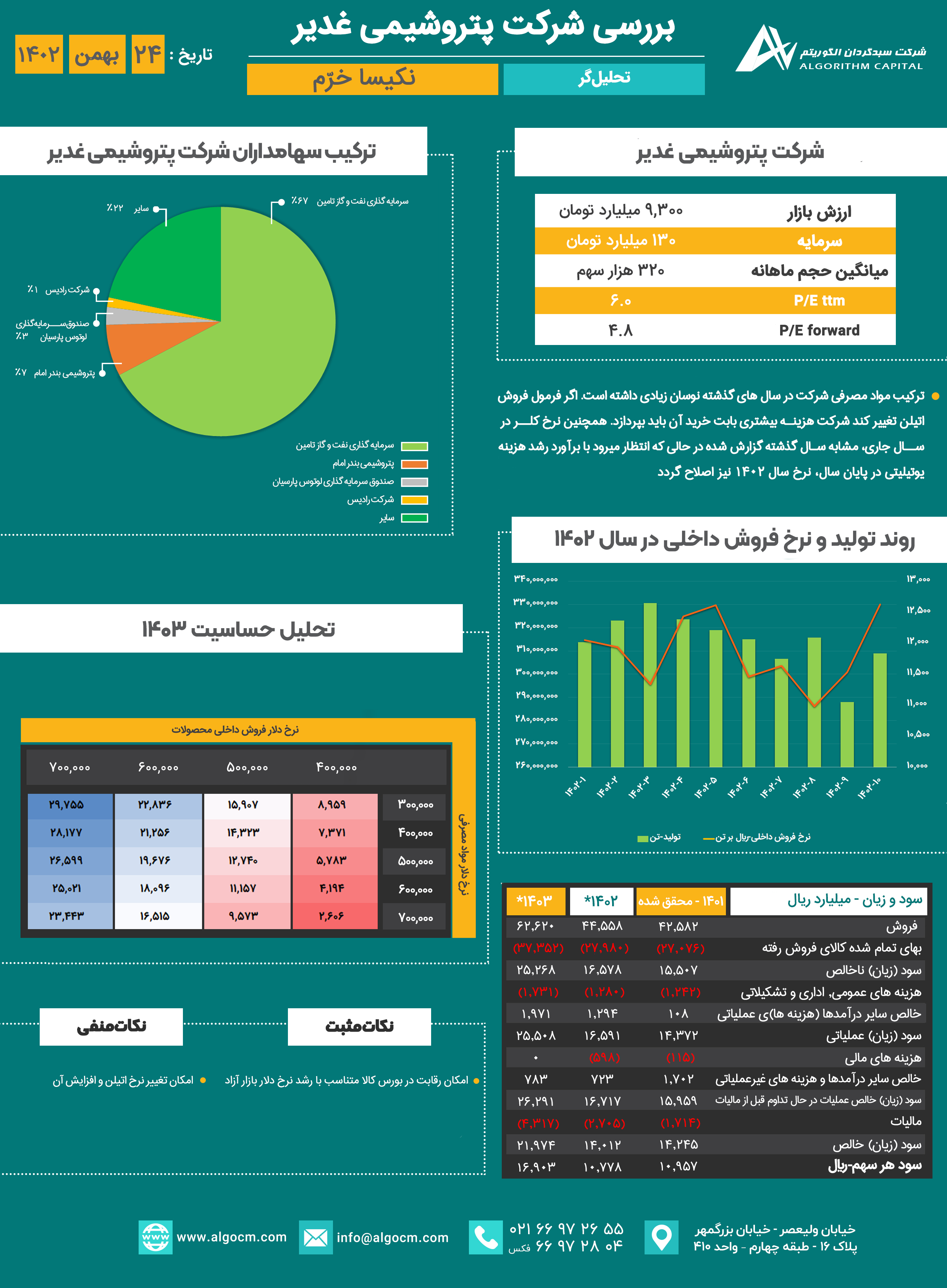 شرکت پتروشیمی غدیر در سال ۱۳۷۸ تاسیس شده و در سال ۱۴۰۰ در فرابورس ایران عرضه گردید. این شرکت در کنار شرکتهای پتروشیمی اروند، بندرامام و آبادان تامین کننده PVC کشور است. ظرفیت اسمی این شرکت در تولید محصول PVC ۱۲۰ هزارتن و VCM ۱۵۰هزار تن میباشد. کلر مورد نیاز در تولید از پتروشیمی اروند و اتیلن از خط لوله اتیلن غرب و پتروشیمی مارون تامین میگردد. بیشتر فروش PVC این شرکت در بازار داخلی صورت گرفته که مطابق عرضه و تقاضا در بورس کالا صورت میگیرد. رشد نرخ دلار در بازار آزاد میتواند منجر به رقابت در بورس کالا شده و با توجه به تغییرات کم نرخ دلار مواد مصرفی، منجر به بهبود حاشیه سود این شرکت گردد.
