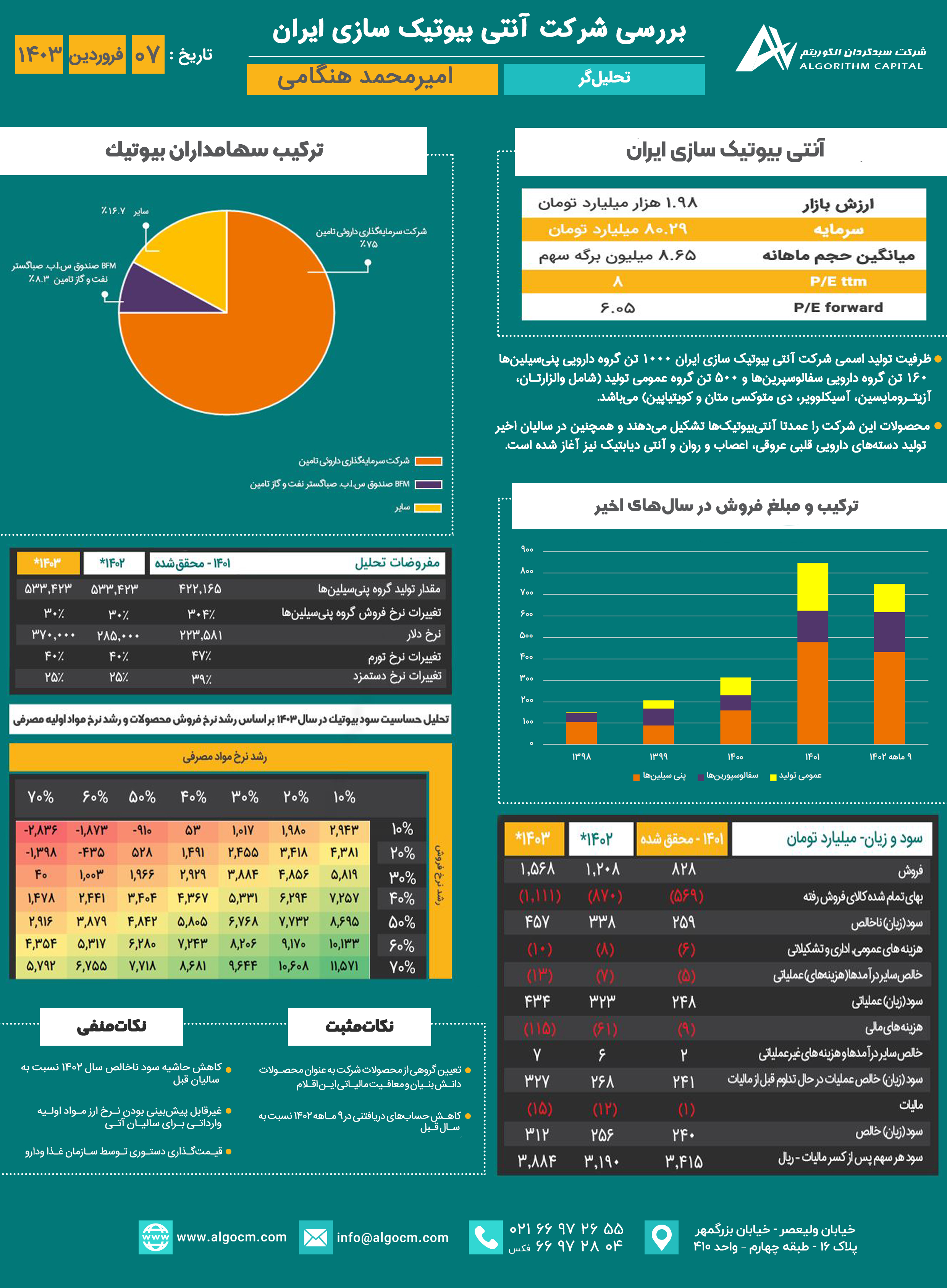 شرکت آنتی بیوتیک سازی ایران در سال ۱۳۷۴ به صورت سهامی خاص تاسیس شد و در سال ۱۴۰۰ به شرکت سهامی عام تبدیل شد. عرضه اولیه این شرکت نیز در بهمن ماه سال ۱۴۰۲ به روش ترکیبی انجام پذیرفت. شرکت عمدتا در زمینه تولید آنتیبیوتیک فعالیت میکند و اخیرا تولید در زمینههای جدید شامل قلبی عروقی، آنتی دیابتیک، اعصاب و روان و آسیلوویر را نیز آغاز کرده است و هر ساله محصولات جدیدی به لیست محصولات فعلی شرکت اضافه میشود. شرکت سرمایهگذاری داروئی تامین با در اختیار داشتن ۷۵ درصد از سهام این شرکت، سهامدار اصلی آن محسوب میشود. سرمایه شرکت در آخرین افزایش سرمایه از ۷۰.۲۹ به ۸۰.۲۹ میلیارد تومان رسیده است که در اوایل سال ۱۴۰۲ ثبت شده و از محل مطالبات حال شده سهامداران برای اصلاح ساختار مالی شرکت صورت گرفته است. در شهریور سال ۱۴۰۱ نرخ ارز شرکت از نرخ ارز دولتی به نرخ ارز نیمایی تغییر پیدا کرد که سبب رشد شدید نرخ فروش محصولات شرکت شد. محصولات آموکسی سیلین و سفالکسین به عنوان محصولات دانش بنیان تعیین شدهاند و به همین دلیل مشمول معافیت مالیاتی محصولات دانش بنیان شدهاند.