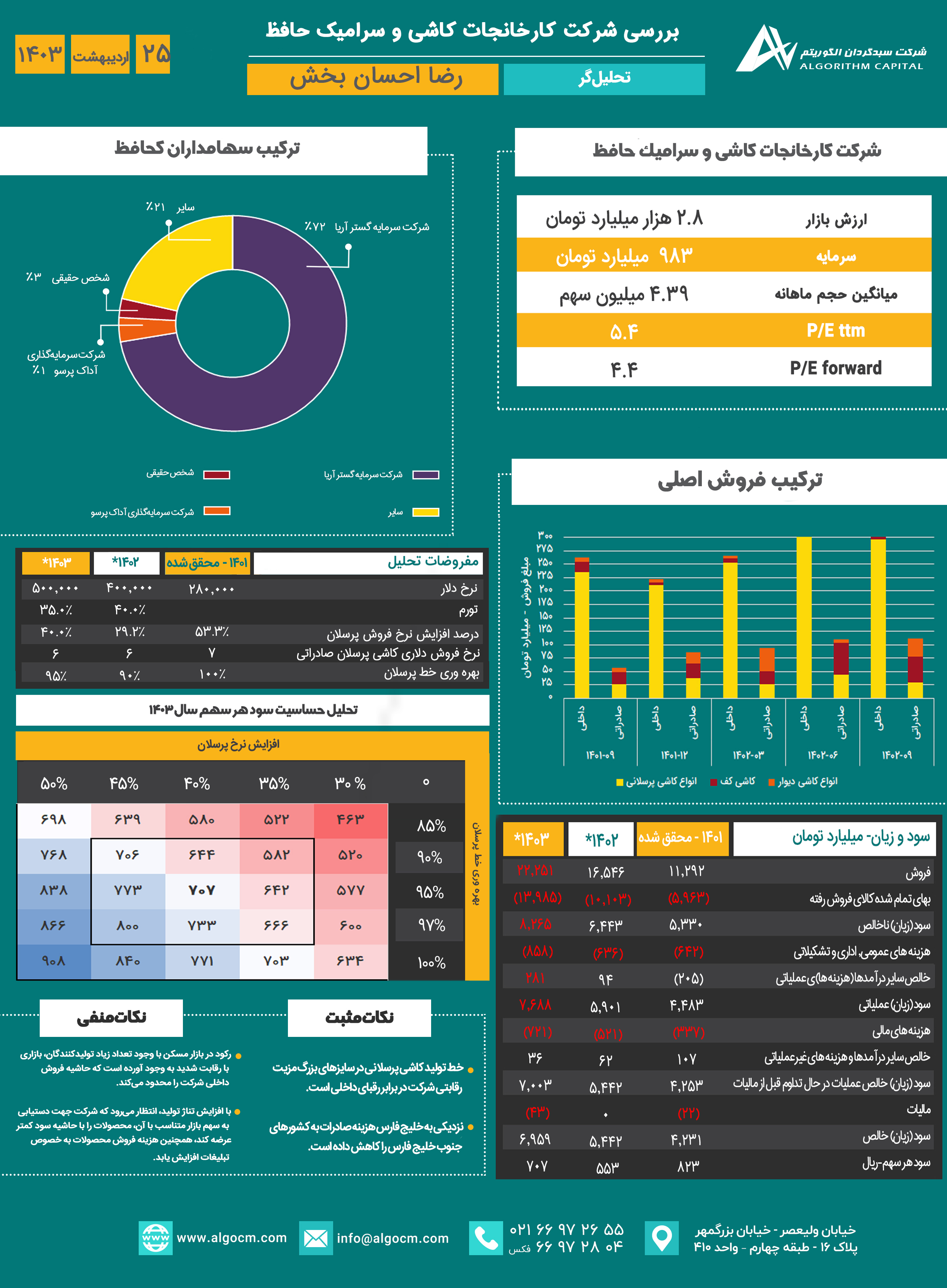 شرکت کاشی و سرامیک حافظ در سال ۱۳۵۵ با هدف تولید انواع کاشی و سرامیک تاسیس گردید. این شرکت در سال ۱۳۷۳ در سازمان بورس اوراق بهادر پذیرفته و به شرکت سهامی عام تبدیل گردید. سهامدار شرکت عمده کاشی و سرامیک حافظ، شركت سرمایه گستر آریا با ۷۲درصد از سهام میباشد و نقش کنترلی در این شرکت ایفا میکند. این شرکت با فروش ۱۶،۵۴۶ میلیارد ریال در سال ۱۴۰۲ در بین شرکتهای فعال در صنعت تولید کاشی و سرامیک در رتبه اول در بین شرکتهای بورسی گروه خود قرار دارد . شرکت در سال ۱۴۰۲ توانسته است ۱۶،۵۴میلیارد ریال فروش داشته باشد و سود ناخالص ۳۹درصدی را محقق کند که در سال گذشته این مبلغ به میزان ۱۱،۲۹۲میلیارد ریال با سود ناخالص ۴۷درصد بوده است.
